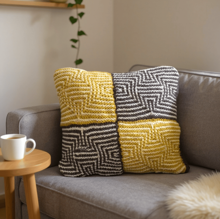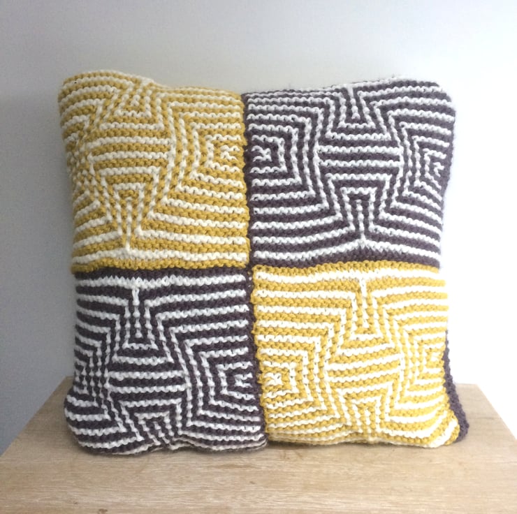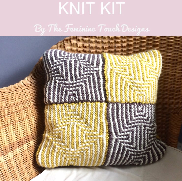 Knitting kit to create this beautiful illusion cushion cover 18" x 18" buttons diagonally down the back. 4 Rainbow Rays illusion squares are sewn together to form the front of this colourful cushion. Each illusion square is created by following a mosaic slip stitch pattern working 2 rows in each colour at a time.