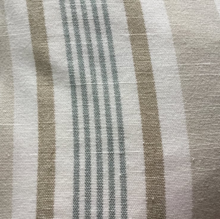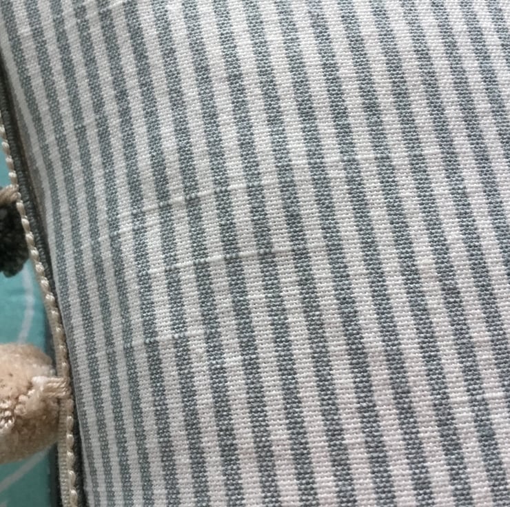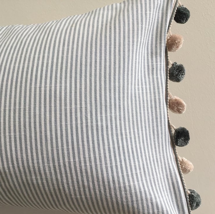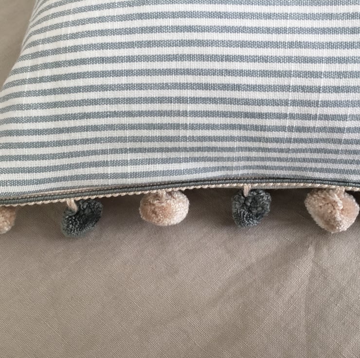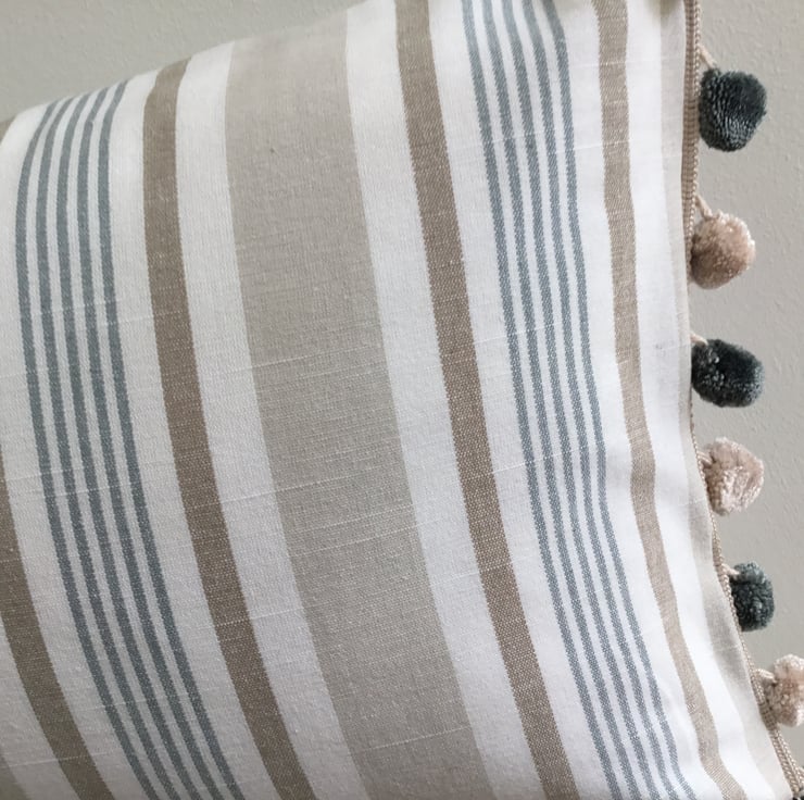 Striped cushion with a different co ordinating fabric each side, in green/teal and beige colourway with matching pom poms.