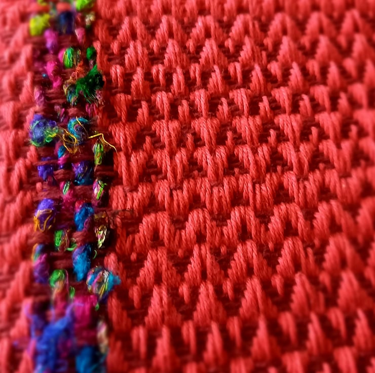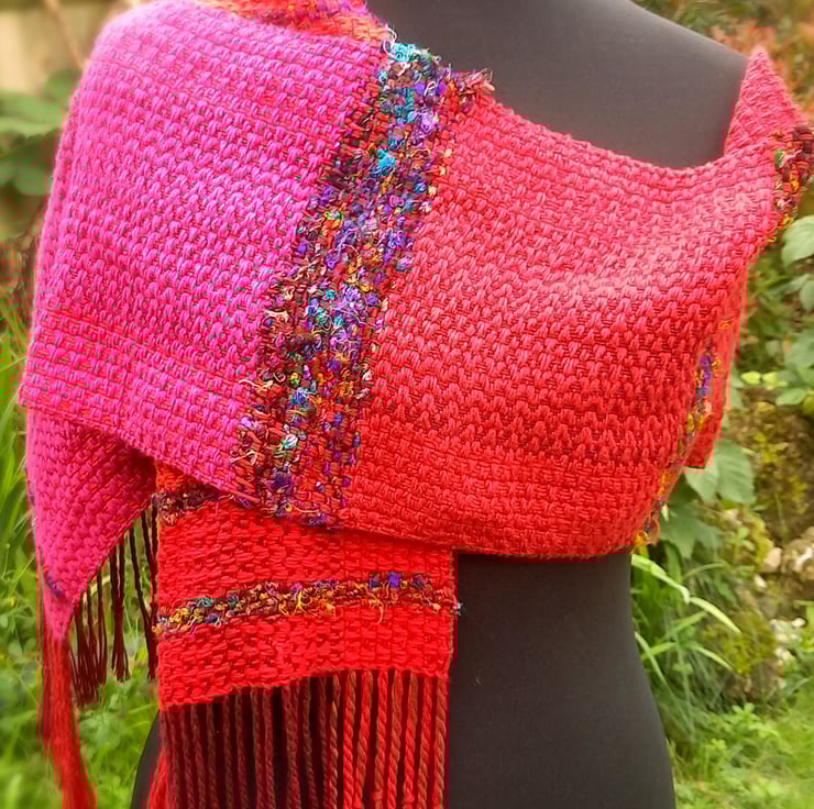 Using a range of red and pink tones of organic cotton as well as recycled sari yarn, this handwoven shawl scarf is a truly unique item.
