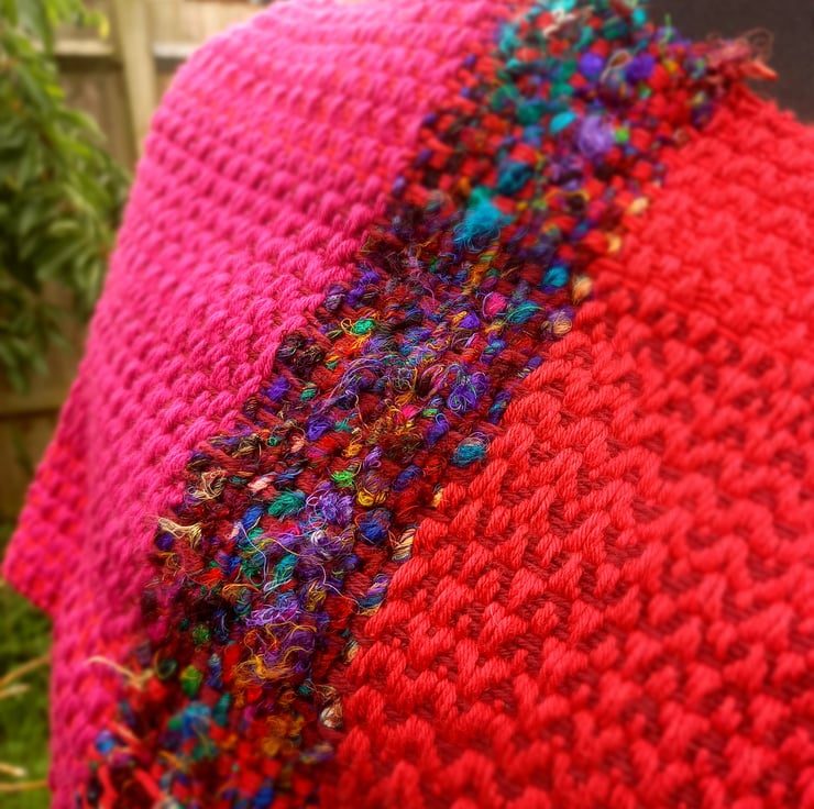 Having been given some recycled sari material made into yarn I thought this would be the ideal addition to bring this shawl to life.