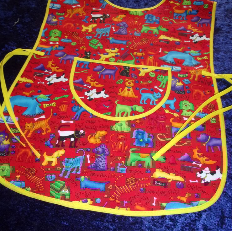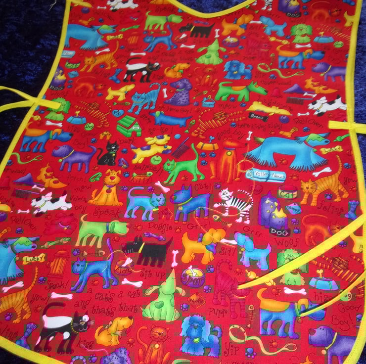 This child's tabard is made using 100% cotton fabric and has colourful cats and dogs in black, white, blue, green, yellow and purple on a bright red background and is edged with bright yellow bias binding. There is a pocket on the front and ties on the sides
