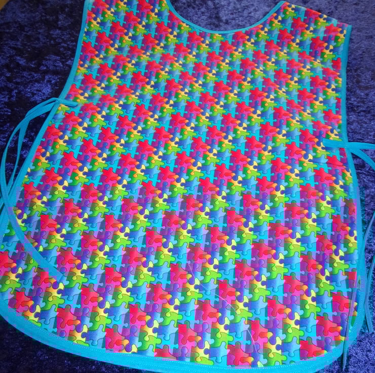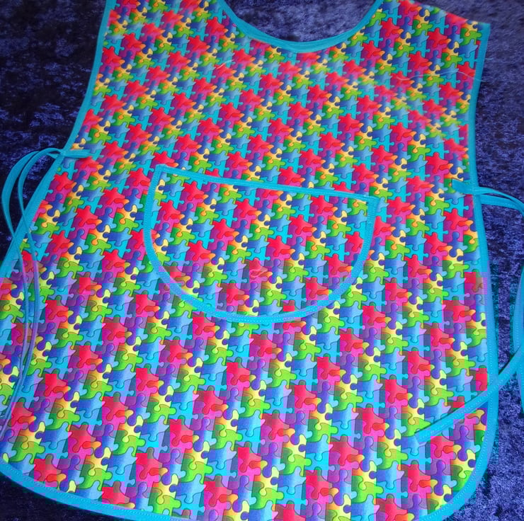 This child's tabard is made using 100% cotton fabric and has an all over design of jigsaw pieces in blue, red, purple, green and yellow it is edged with a contrasting Turquoise bias binding. There is a pocket on the front and ties on the sides