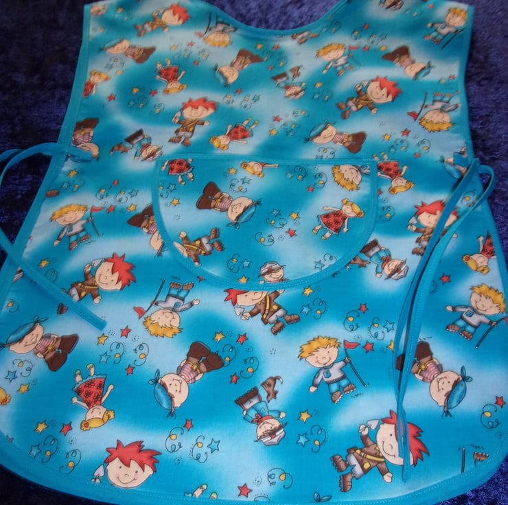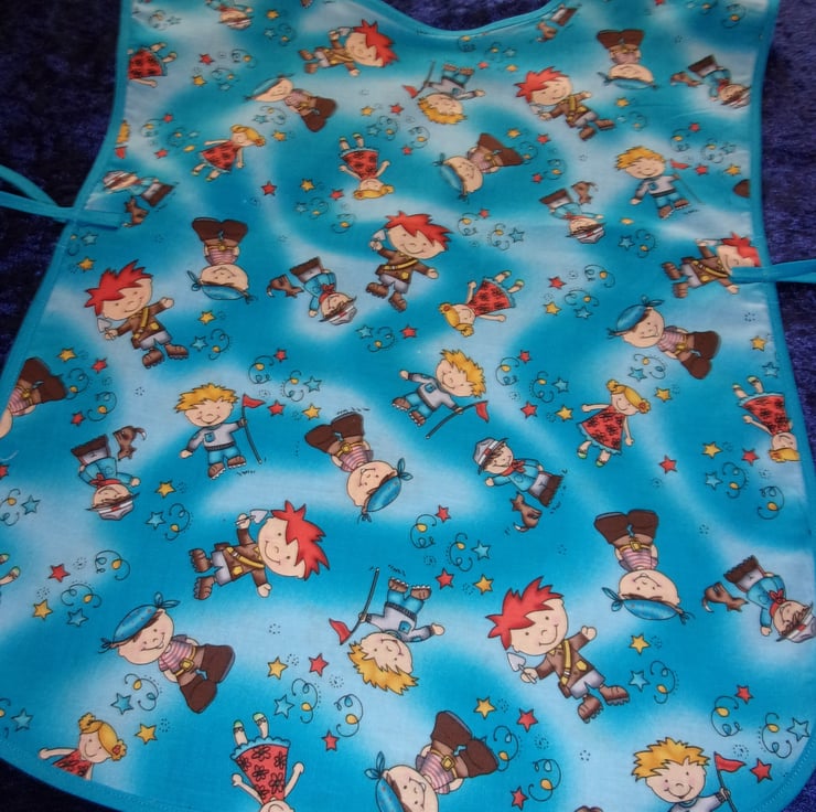 This child's tabard is made using 100% cotton fabric and has boys and girls in fancy dress costumes on a bright blue background and is edged with a contrasting blue bias binding. There is a pocket on the front and ties on the sides