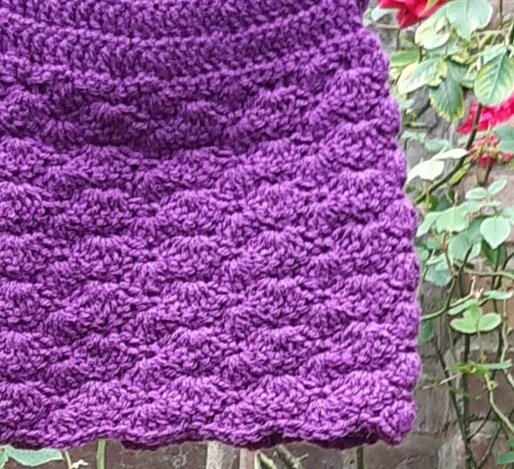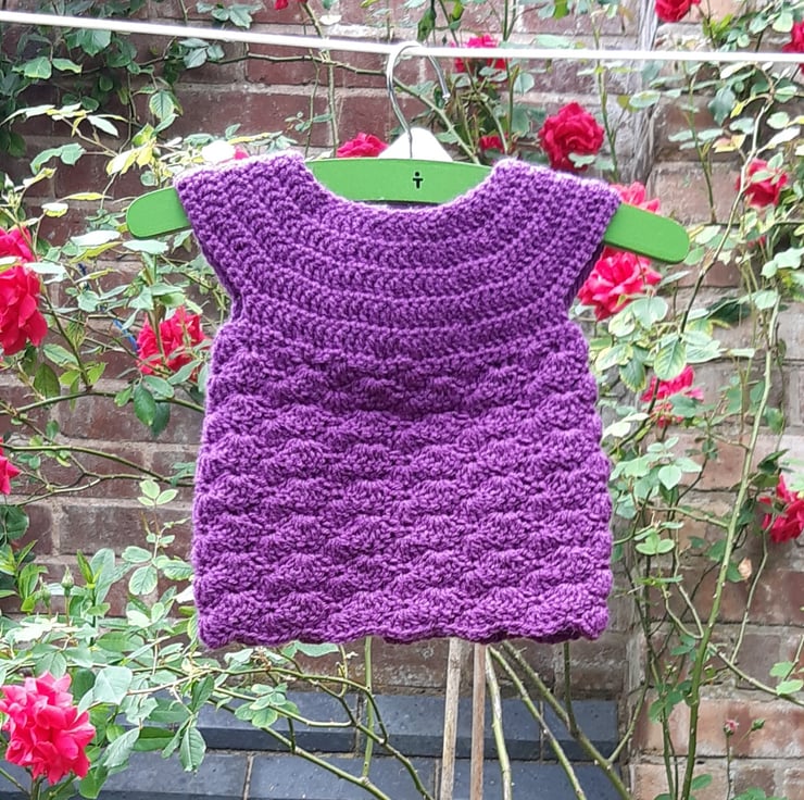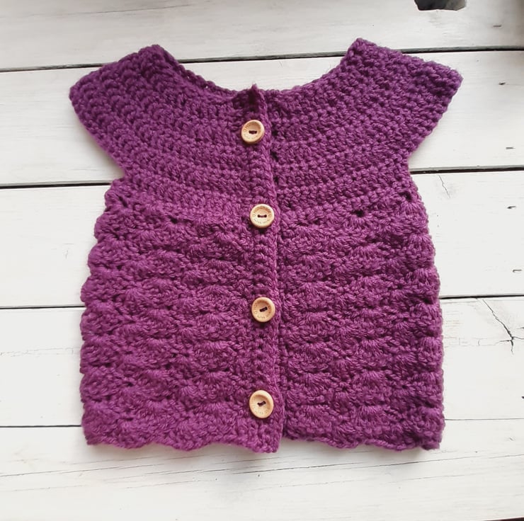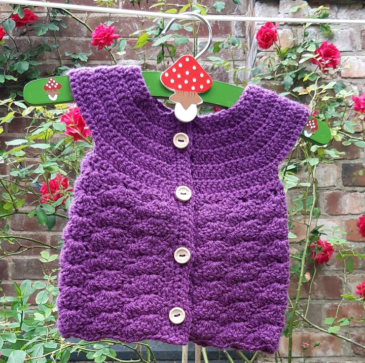 This is a cute little sleeveless, purple cardigan for a 0-3 month old baby. It is made using a yolk for the upper part and a shell pattern for the body, creating a wavy pattern at the bottom. It has 4 wooden buttons down the front, with the words, 'Handmade with love', displayed on them. Gift packaged.