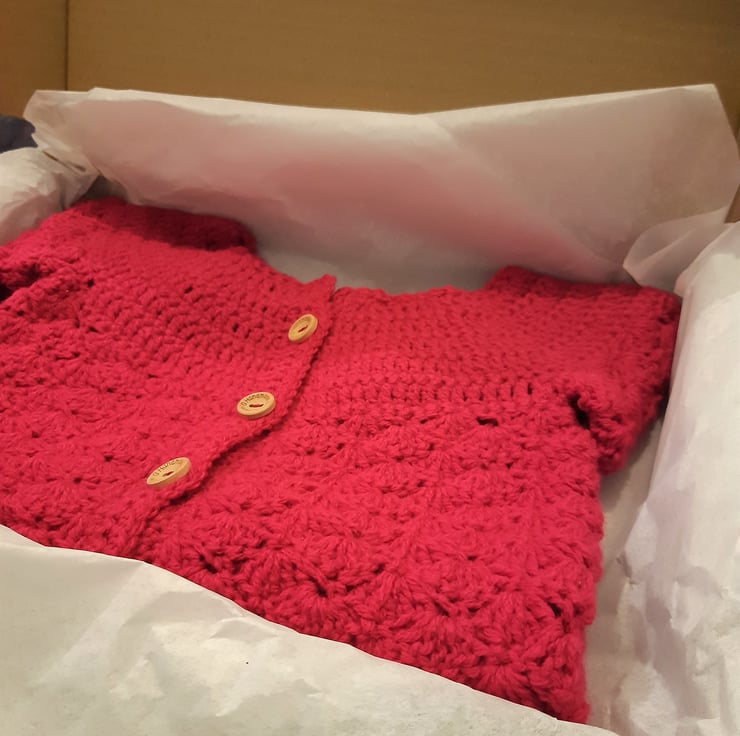 This is one of the cardigans I made as part of my original baby girl cardigan pattern collection. See my shop for more colours and variety.