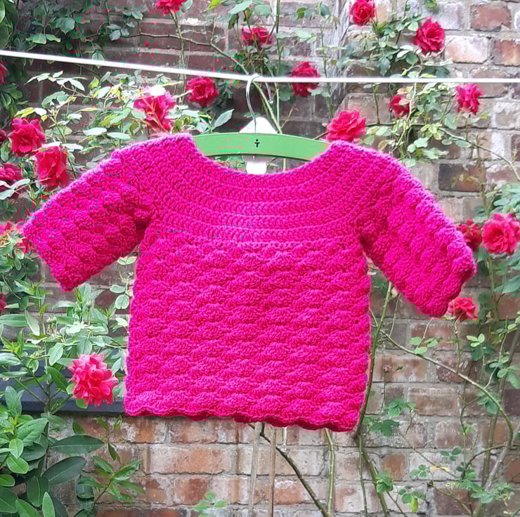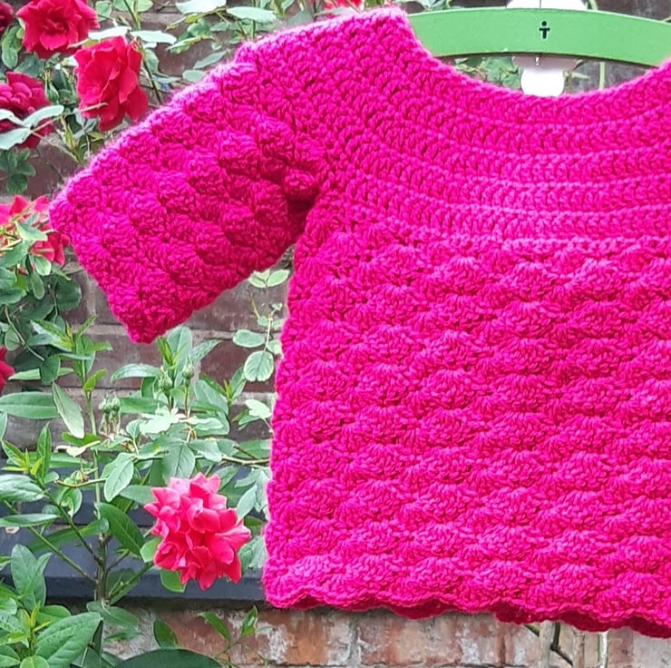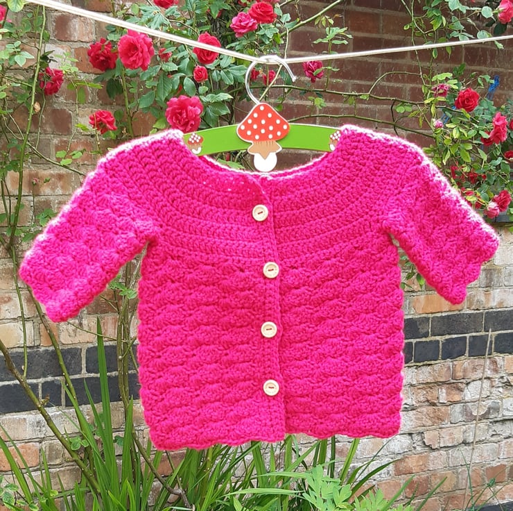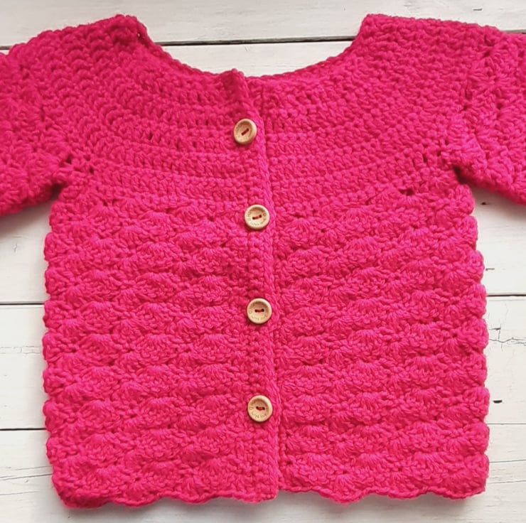 This is a cute, shocking pink baby cardigan with sleeves, for a 6-9 month old baby. It is made using a yolk for the upper part and a shell pattern for the body and sleeves, creating a wavy pattern. It has 4 wooden buttons down the front with the words, 'Handmade with love', displayed on them. Gift packaged.