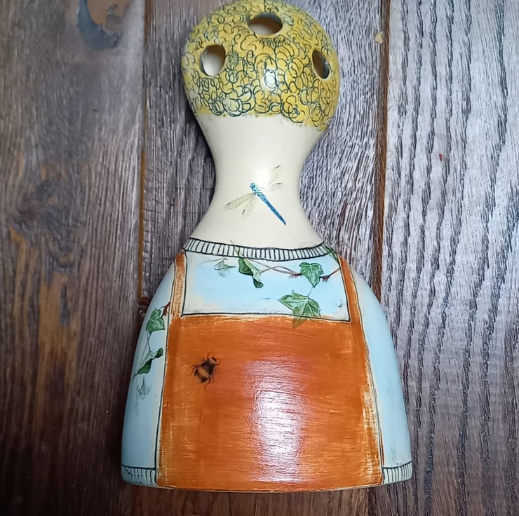 Handmade in white clay and painted with coloured slips and glazed in a transparent glaze. Ceramic decals of flowers birds and insects are fired on to add detail. Openings at the back allow for flowers and grasses. Measures approximately 23cms.Will be carefully packed and posted.