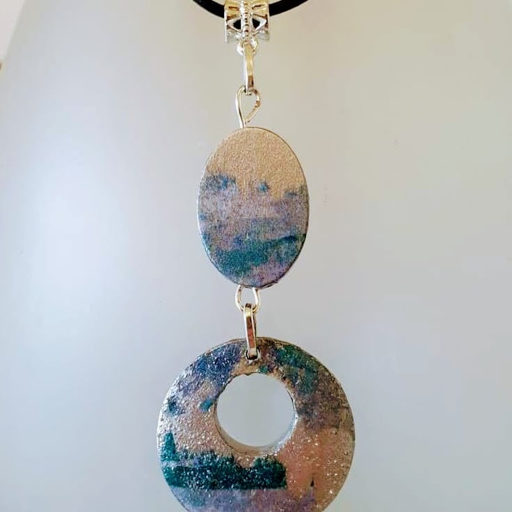 Wood pendant. Hand painted,decoupaged and embossed in a silver, lilac, blue, green colour design.
