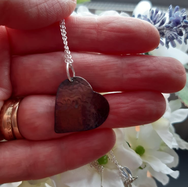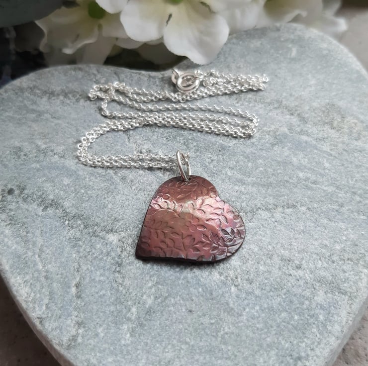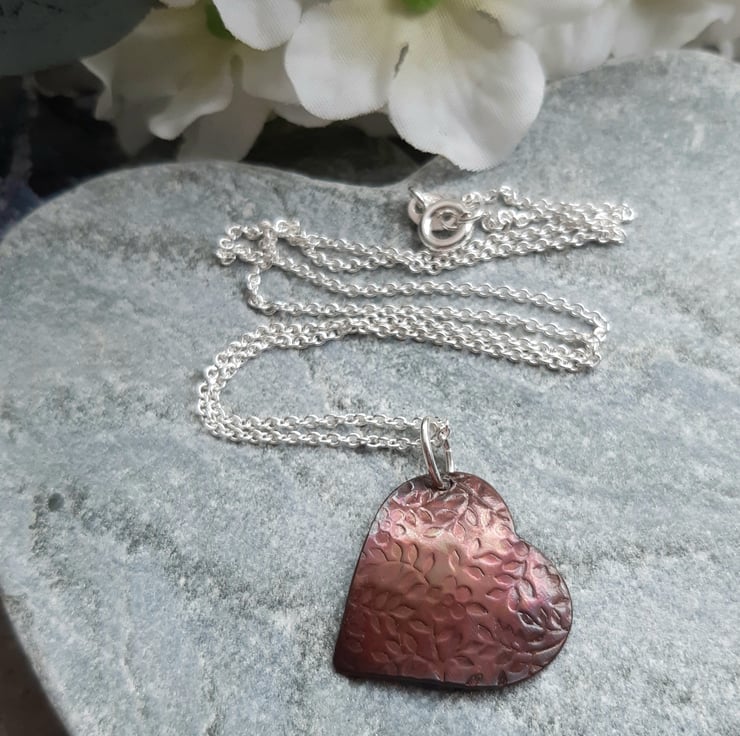 Copper heart pendant which has been cut from a sheet of copper has a leaf and flower pattern texture. The copper has then been slightly domed and lightly oxidised to give deep colour tones of deep pink and a little blue/green colour shows more as the pendant moves.