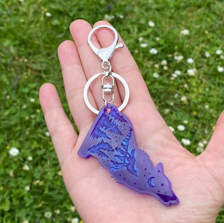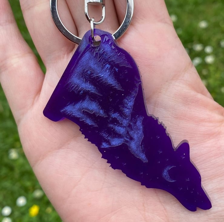 Purple wolf keyring, made with resin and ethically sourced mica powders. This listing is for C. Langlois.