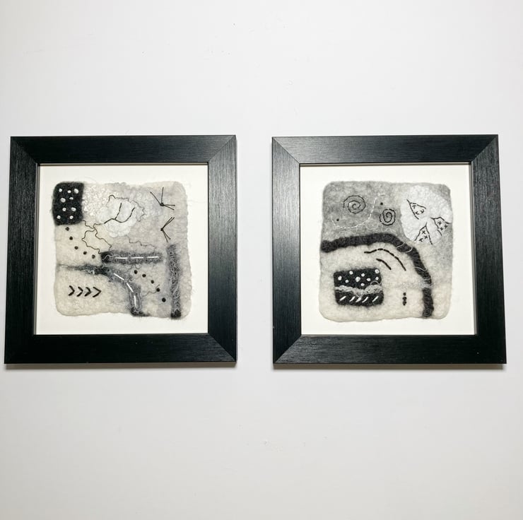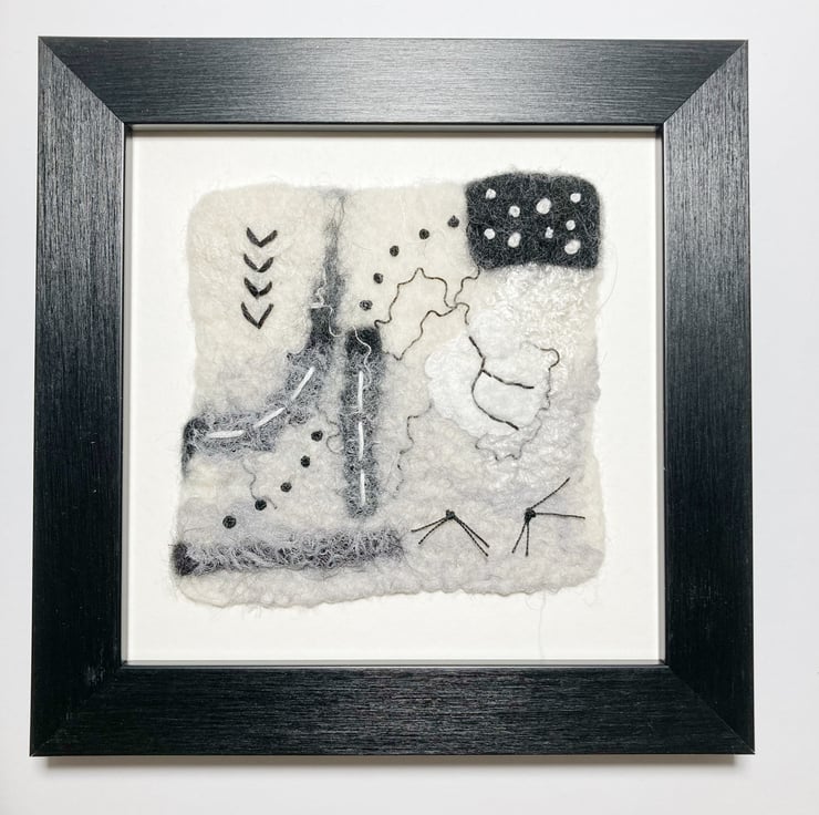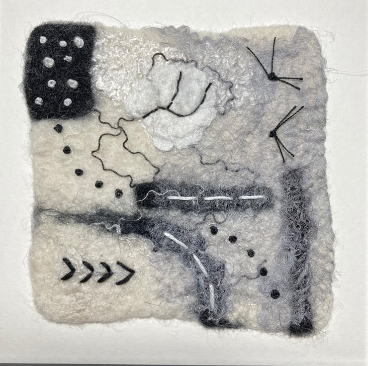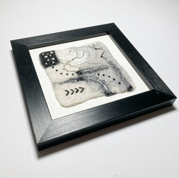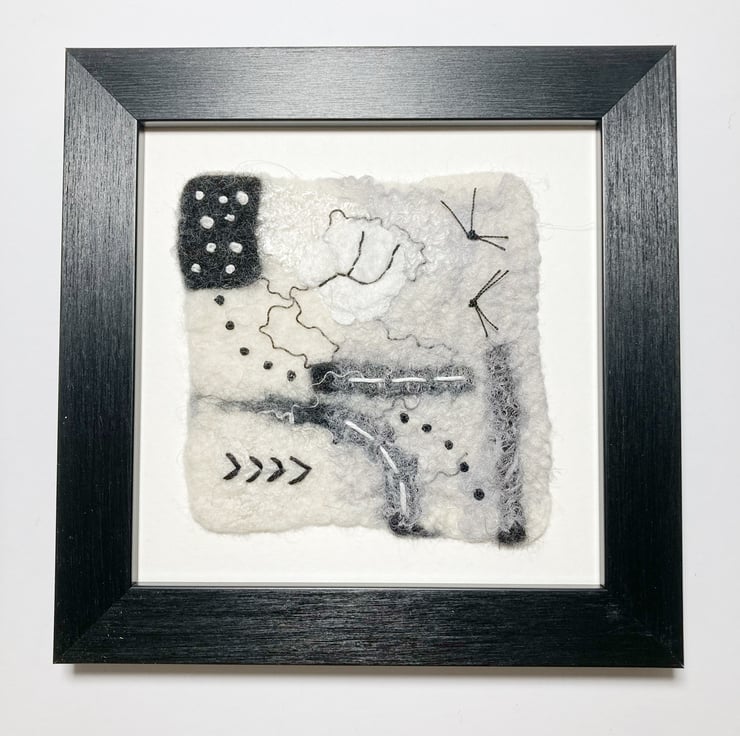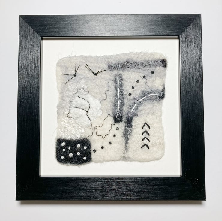 A lovely monochrome abstract that is full of detail and texture. This picture measures approximately 3.5" x 3.5" and is mounted on white card, framed in a black 5" x 5" frame. The picture has been formed by wet felting several layers of merino wool fibres overlaid with various plant, animal and synthetic fibres and cotton and silk fabric pieces. Once felted further detail and texture has been added by the means of hand embroidery stitches. This is one of a series of monochrome abstracts, rich in texture and open to your own interpretation. It can be hung in any orientation as demonstrated in the pictures. Why not create a stunning montage with 2,3, 4 or more pictures from this series.