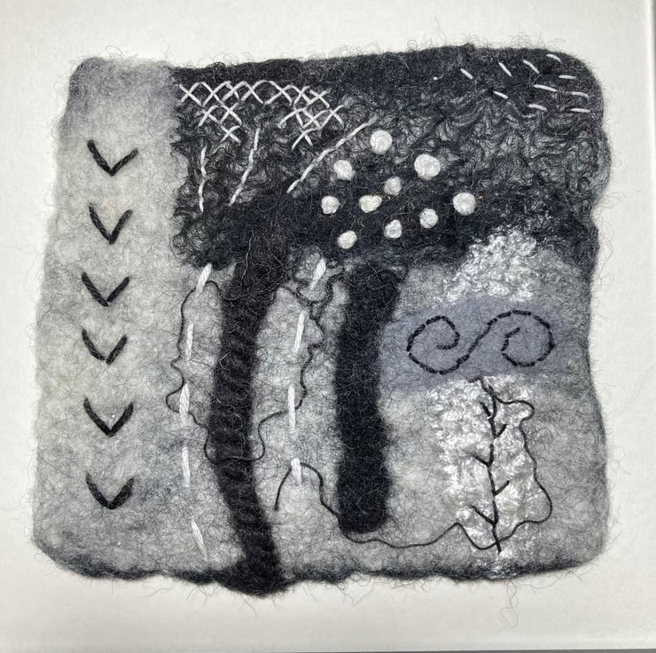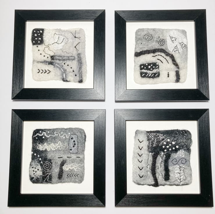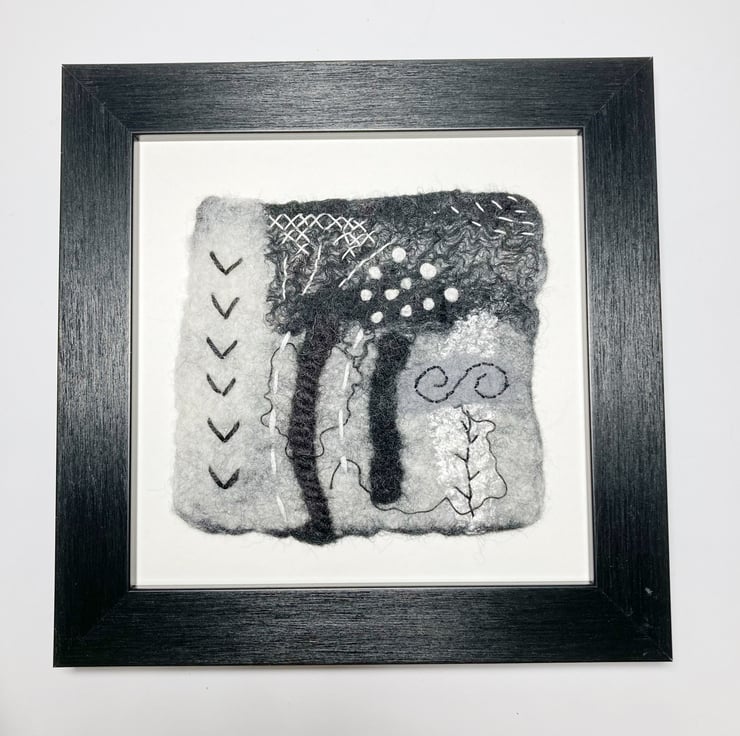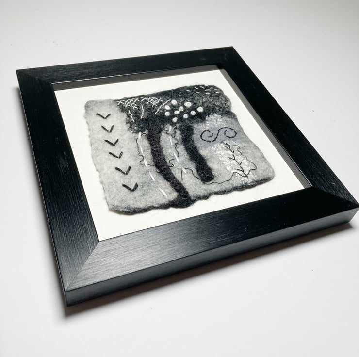 The resulting artwork is rich in texture. The felt art measures approximately 9cm x 9cm (3.5" x 3.5") and it has been mounted on white card in a square black frame. The frame is unglazed allowing the texture of the piece to be clearly visible. The frame has both a hanging hook and prop stand on the reverse.