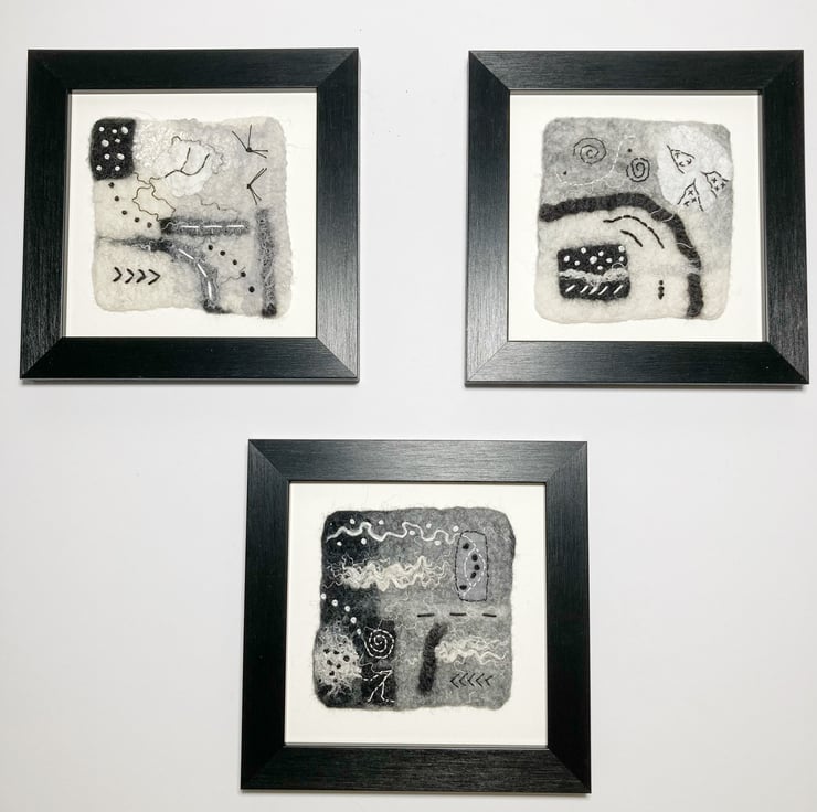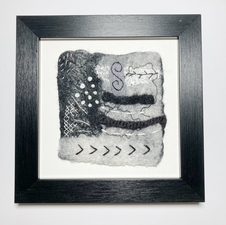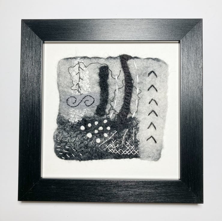 This framed felt monochrome abstract picture is one of a series available in my shop. Included in Seconds Sunday as an end of line item. The picture has been hand felted using merino wool fibres as a background with various natural and synthetic fibres and fabrics added to the surface to provide texture and detail. Further detail has been added using hand stitching in black and white threads. The picture is open to your own interpretation and can be hung in any orientation as illustrated in the photos - the choice is yours.