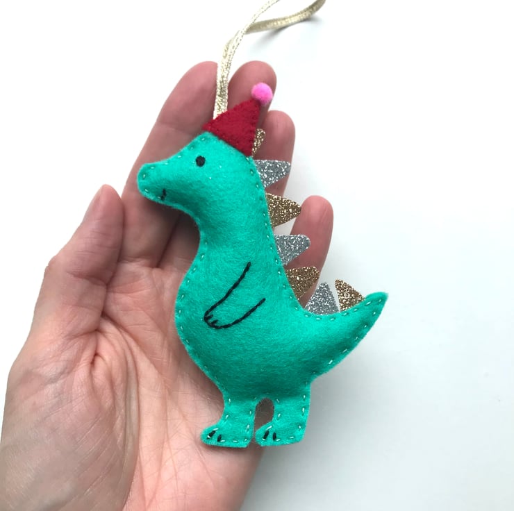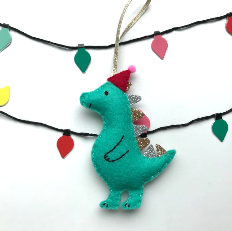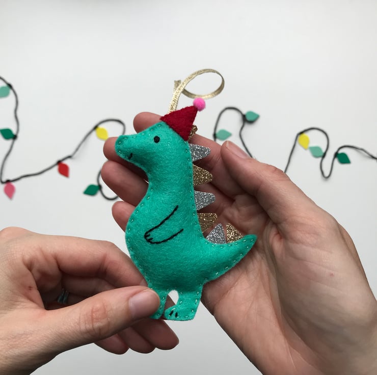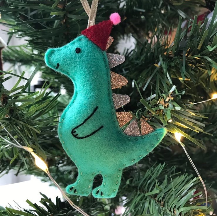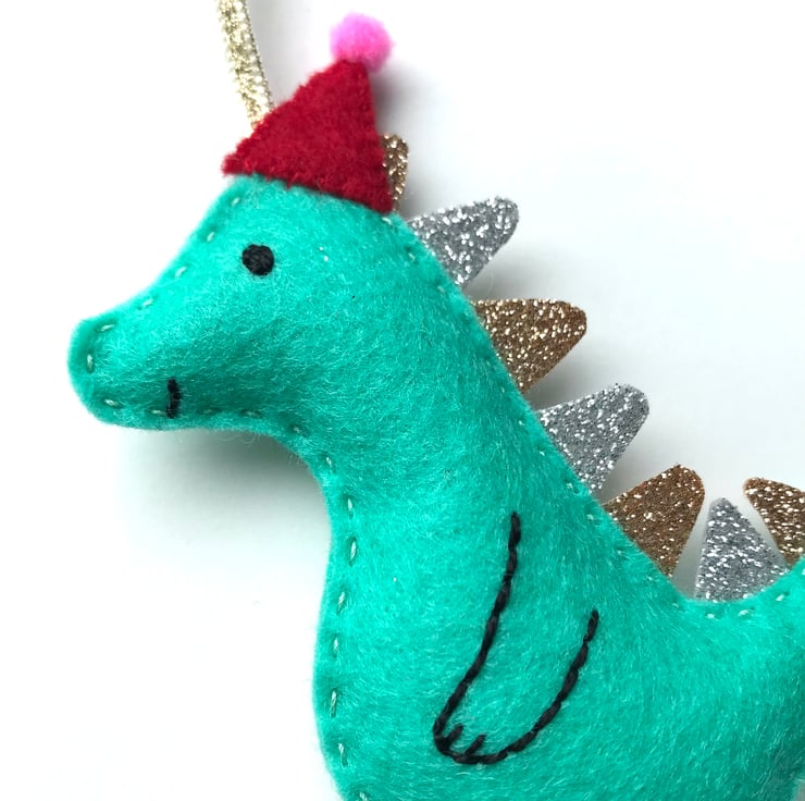 Each dinosaur is completely hand made, the 100% wool felt is cut by hand and face details are added with hand embroidery. The glittery spikes are stitched into place by hand, as is the party hat complete with tiny neon pink pompom. The dinosaur is carefully stuffed with toy stuffing which is made from recycled plastic bottles! A ribbon loop is sewn into place and the dino is ready to hang on your tree.