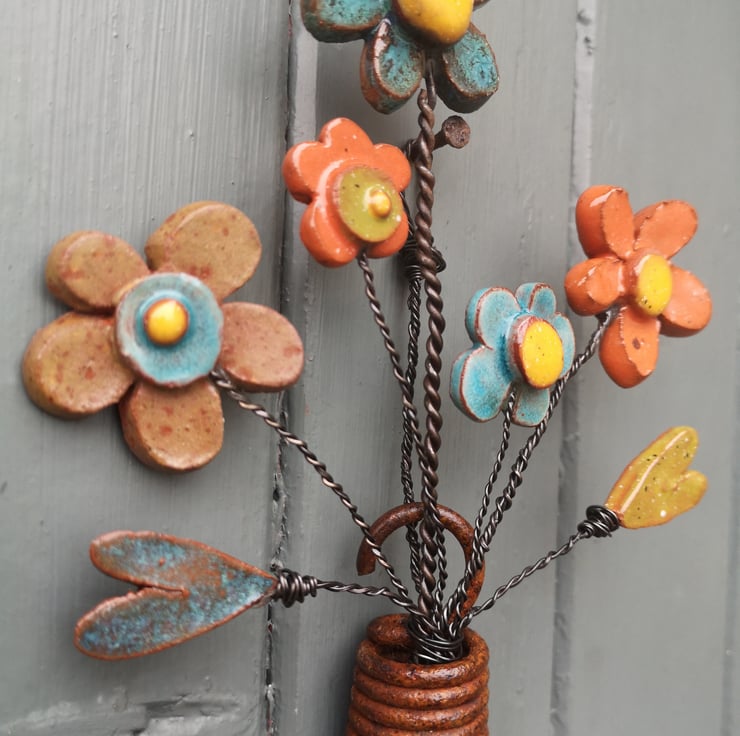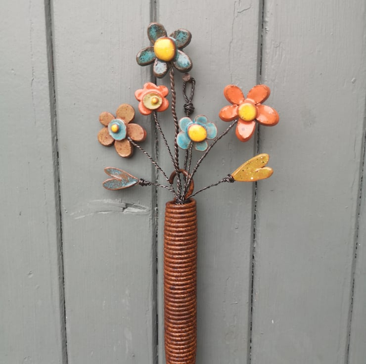 A bunch of Pottery Flowers and foliage arranged in an upcycled spring!