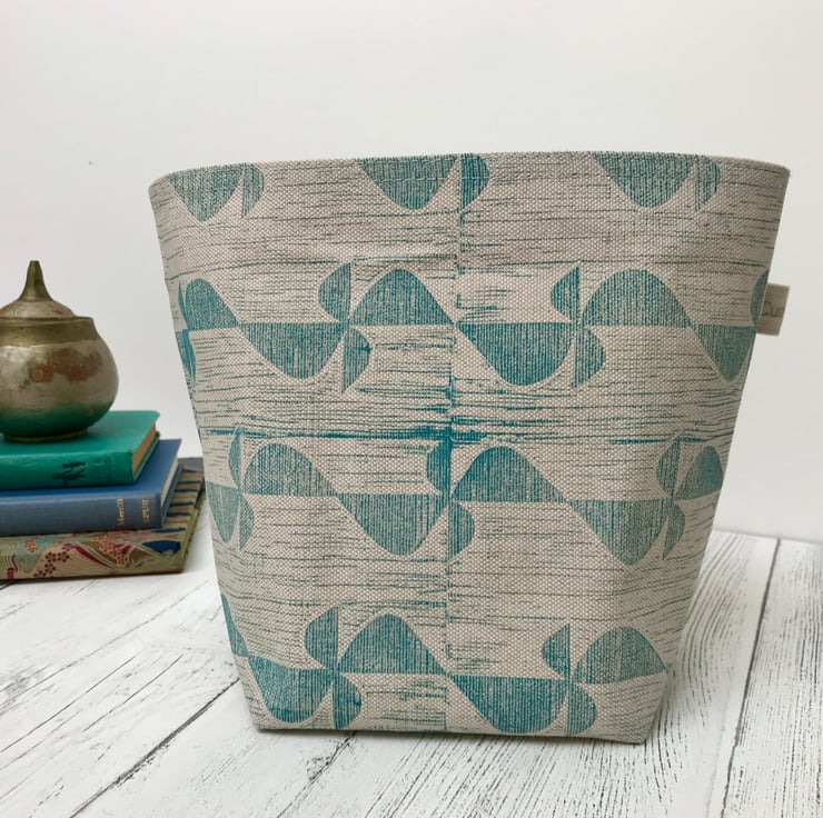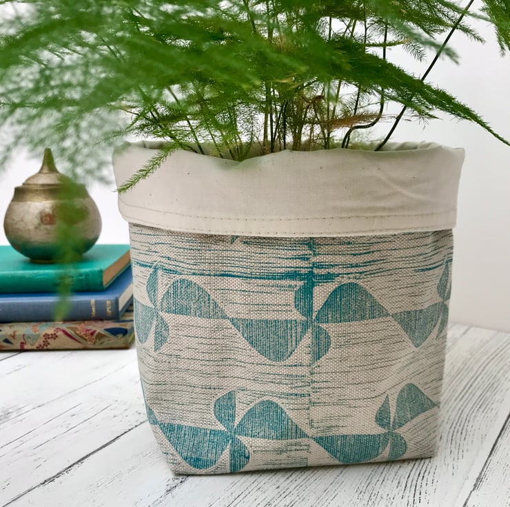 This unique design is block printed by hand using Eco-Friendly inks on to natural Linen Union fabric woven in Scotland. The lining is 100% cotton calico. The top can be folded down or left standing up for more storage
