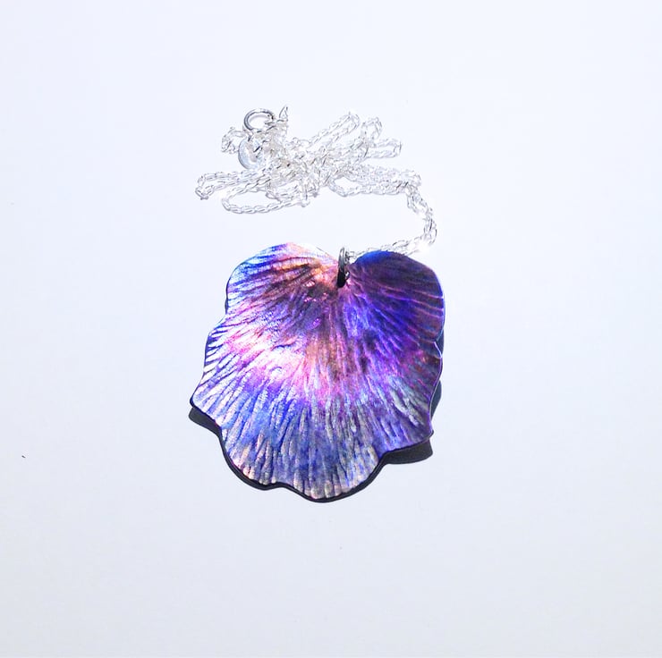 I have hand sawed the flower from titanium sheet before giving it a hammer textured finish and slightly domed shape. I have then coloured it to create a unique piece.