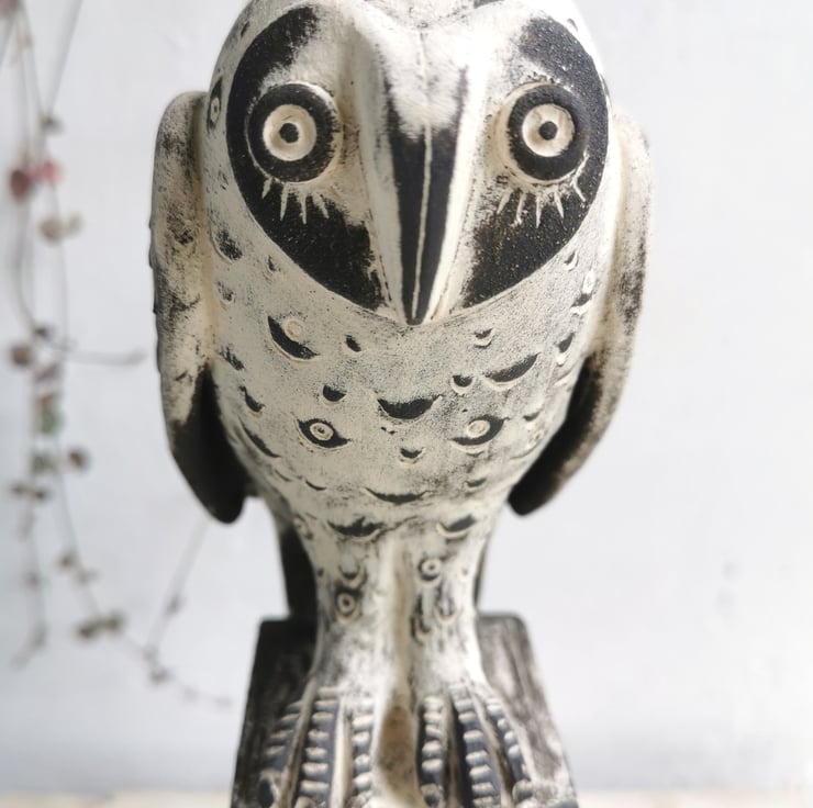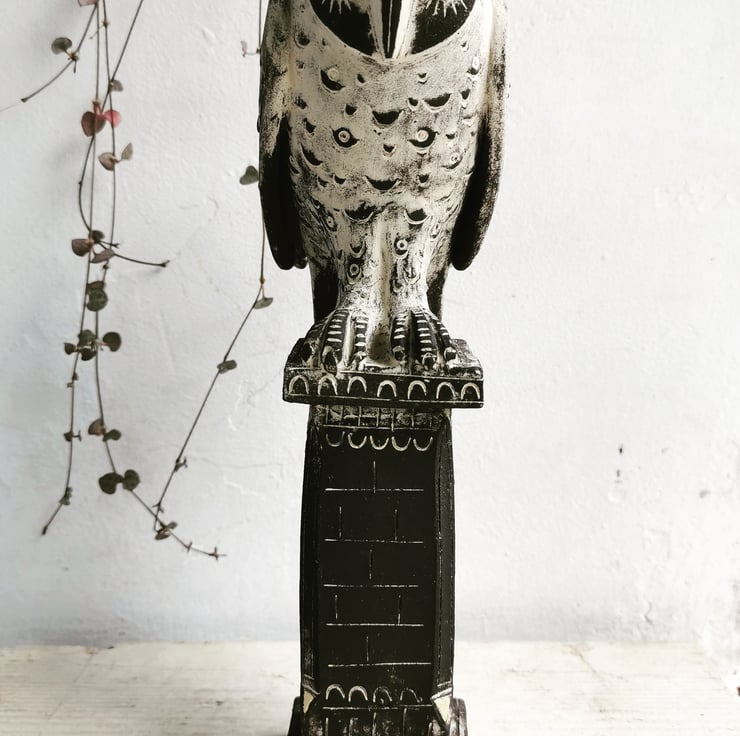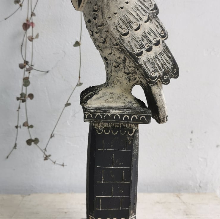 An exquisite Owl sculpture on plinth. A unique original ceramic sculpture. Title : Owl on ornate chimney pot. Gilded with gold coloured metal leaf to embellish the incised decoration on the Victorian style chimney stack. Hand formed from black stoneware clay, this ceramic sculpture is available with tracked shipping to Australia, Canada, USA or free tracked UK shipping.