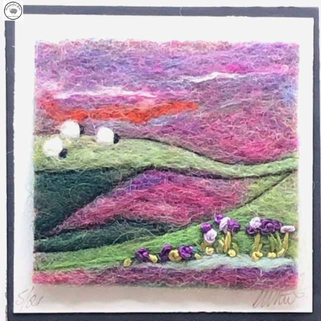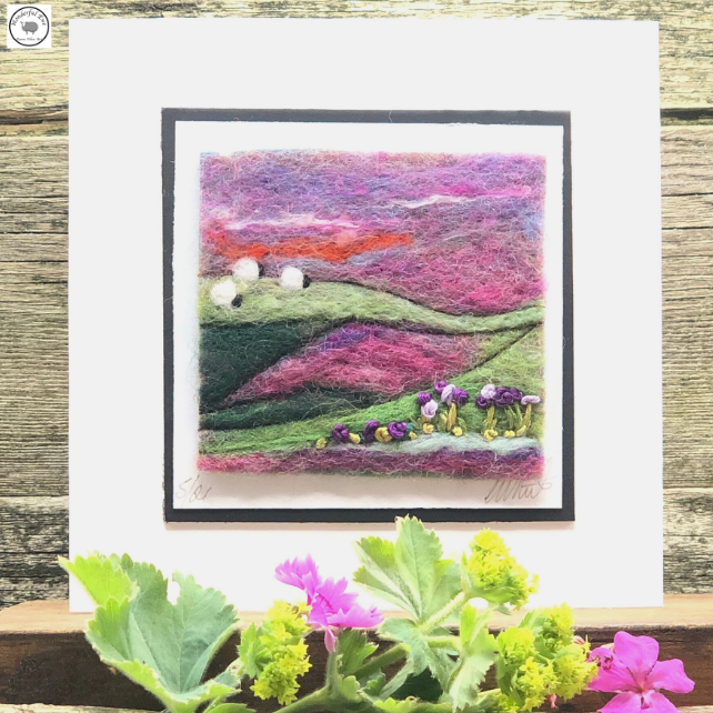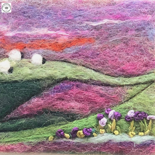 This picture was made by alternating many layers of wool then wet felting followed by needle felting and finally free motion embroidery. A technique that takes many hours.