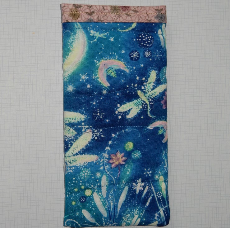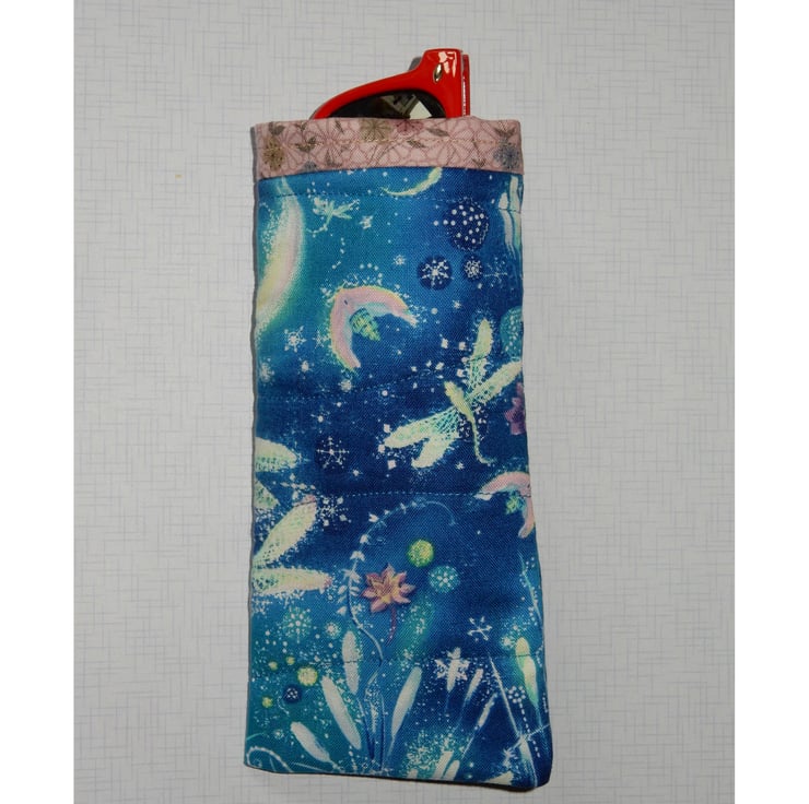 There is a mystical quality to the dragonflies that feature on this handy case for your glasses or sunglasses. It is made from a cotton print fabric with a toning print lining and trim. It also has a layer of wadding for protection. This is a slip in style glasses case, if you require a case which fastens please view my other listings.