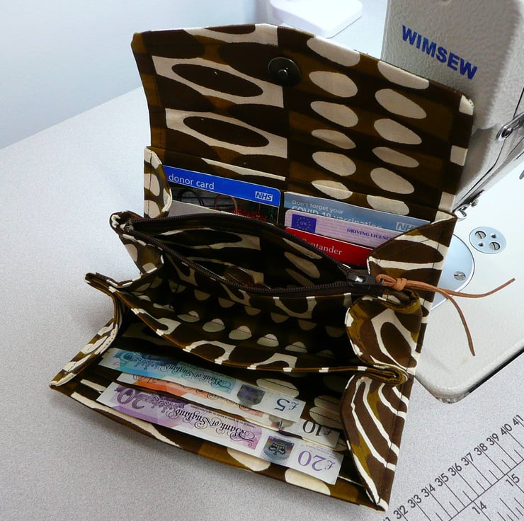 This large purse is made from African waxed cotton throughout in khaki and cream tones, it comprises of 6 credit card slots, 4 large slots for notes & receipts, a zip section for small change and space in the centre for a small bottle of hand sanitizer.