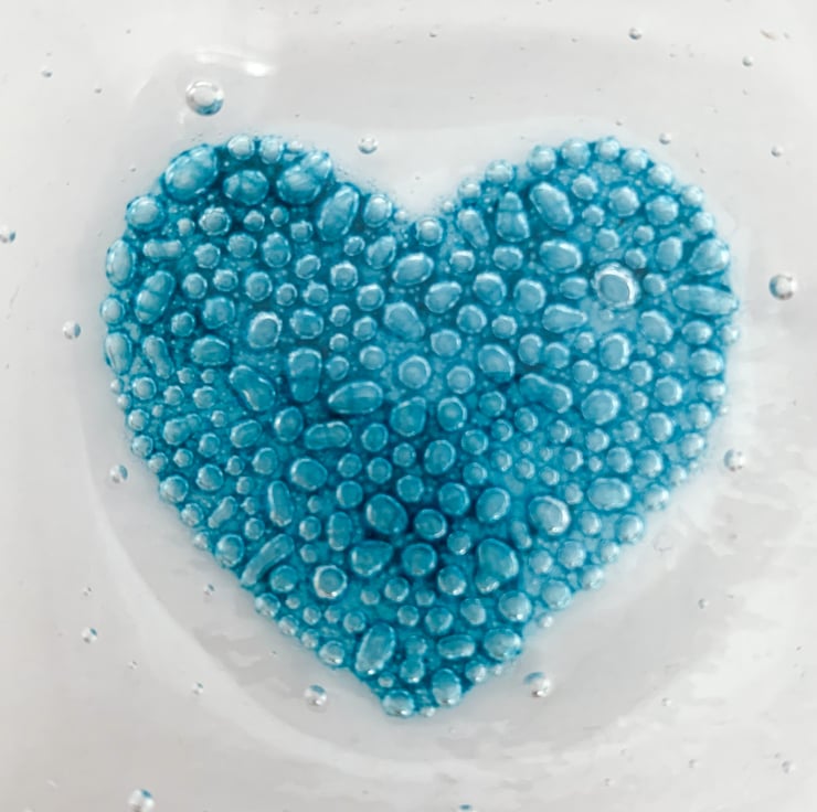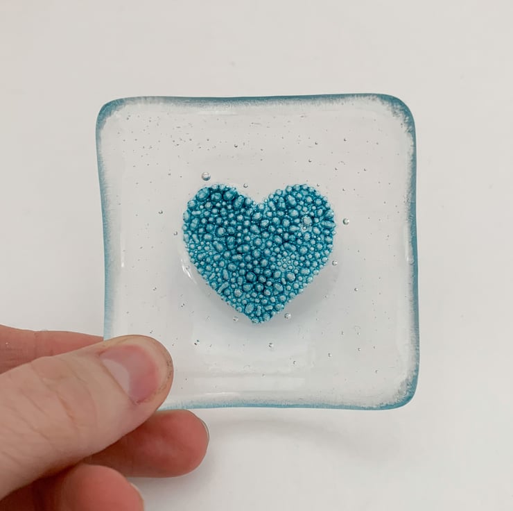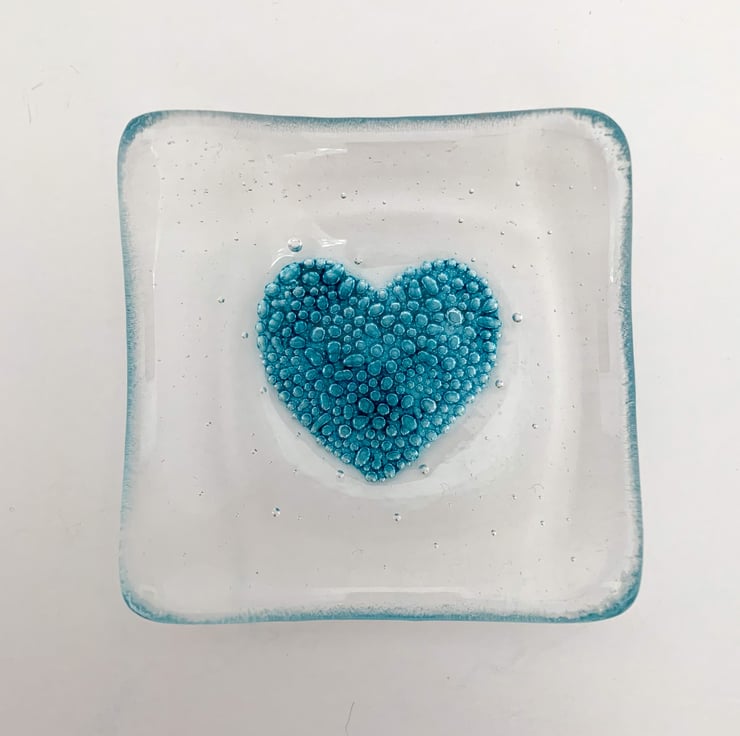 Fused glass dish with a handpainted bubbly turquoise heart in the centre. Perfect for having on your bedside table and putting your earrings in.
