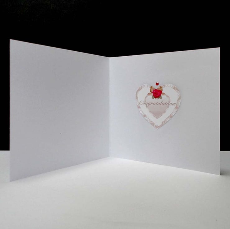 Inside is a smaller patterned heart, saying congratulations, a single red rose and a red glass gem.