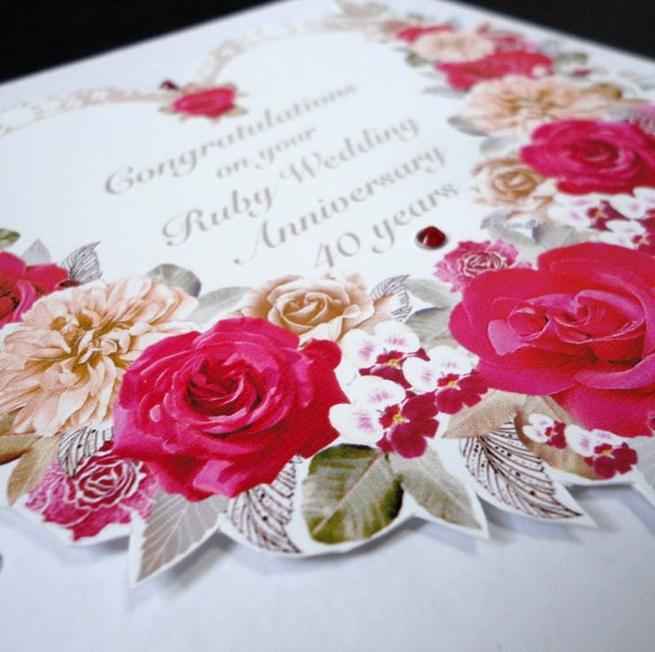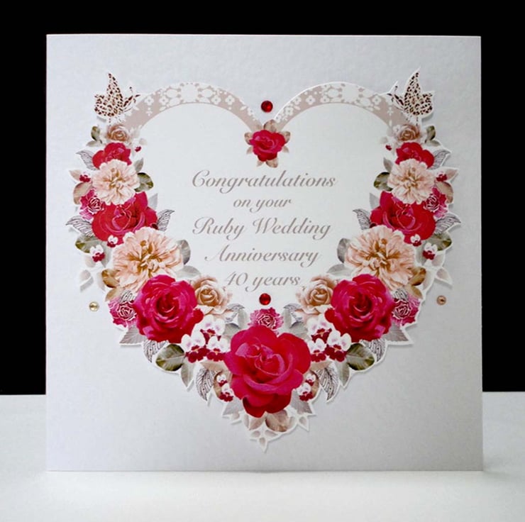 A Ruby Wedding Anniversary, 40 years of marriage really warrants an extra special card. These beautiful clusters of velvet red come fresh straight from the garden. With warm gold roses, gold brown and olive green leaves, and a few clusters of pansies they make up this gorgeous decorative heart. The centre of this floral heart is a message of congratulations with a central small rose above and butterflies each side.