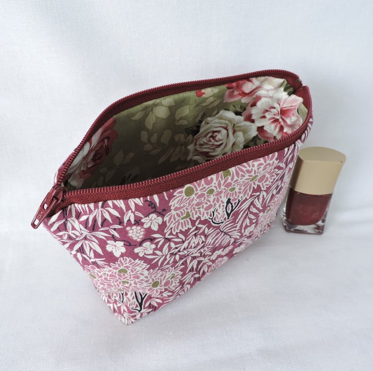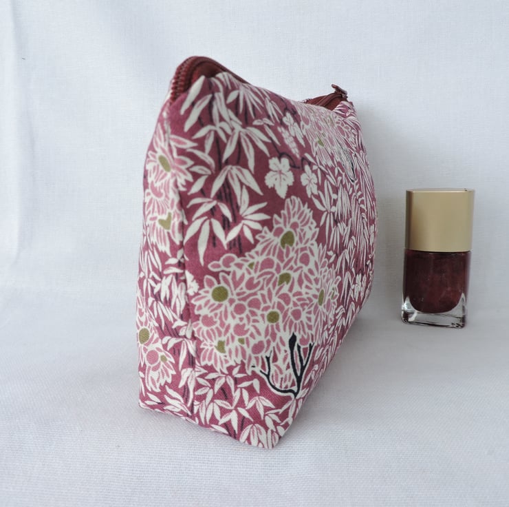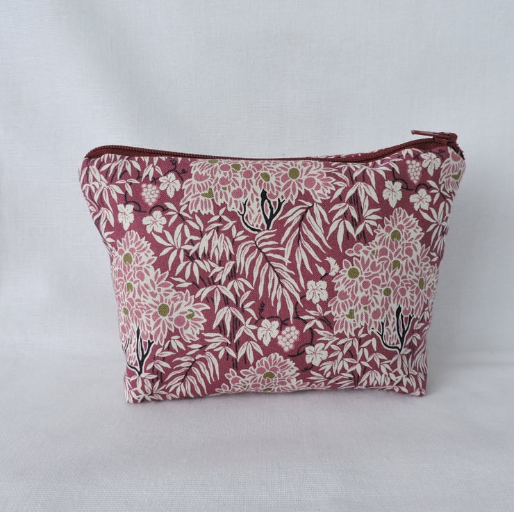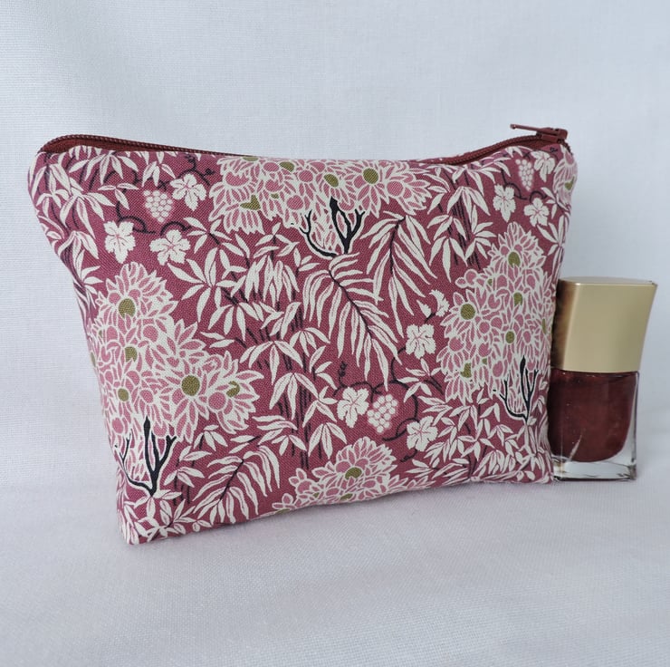 I've made this make up bag, cosmetic bag with a pretty cotton fabric from the Winterbourne House range from Liberty. Trees, vines and ferns are the theme in beautiful colours of plum, pale pink, olive, cream and black.. It has interfacing to give the bag stability and is fully lined in an olive, pink and pale pink floral cotton fabric and has a burgundy top zip. The bag has a squared off bottom so that it stands up.
