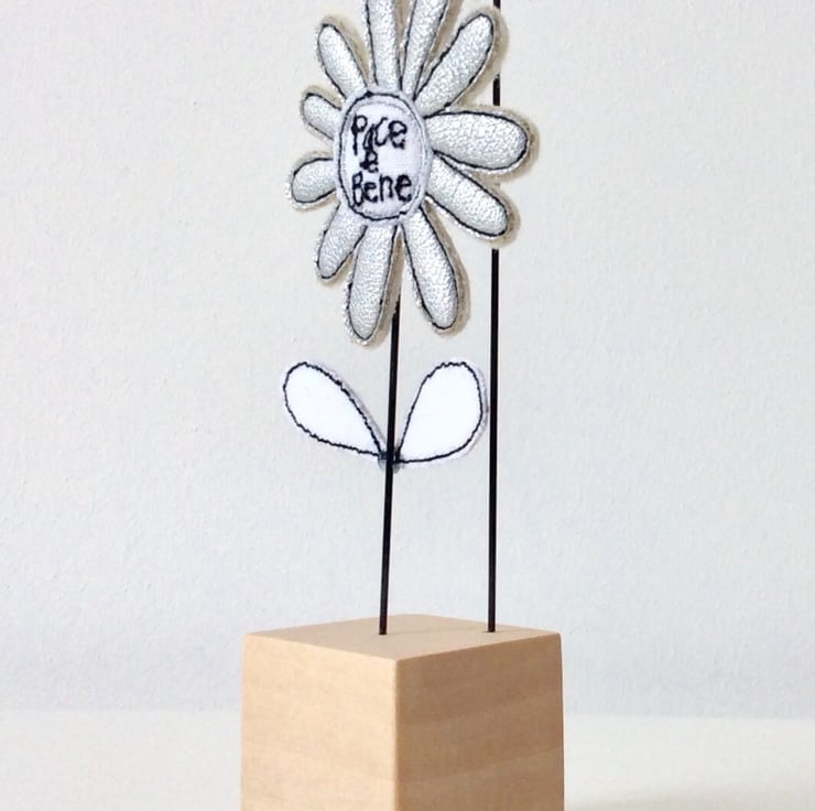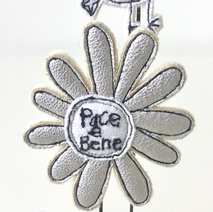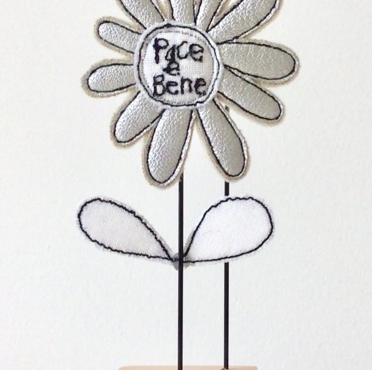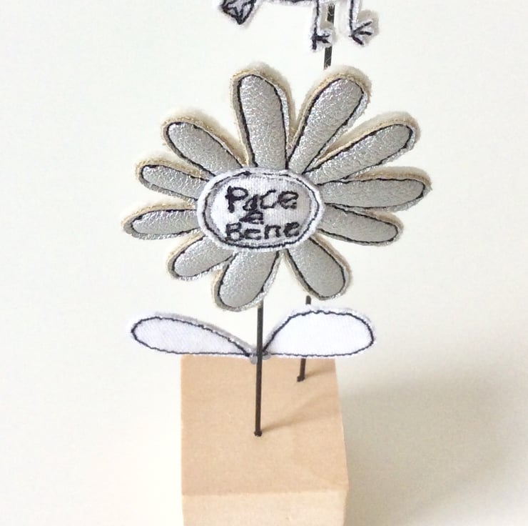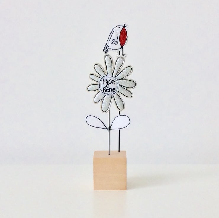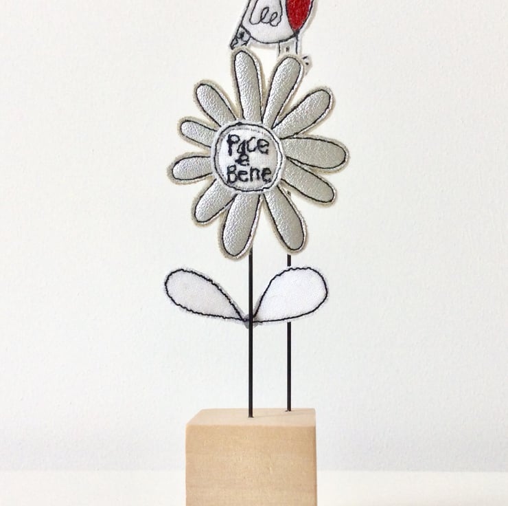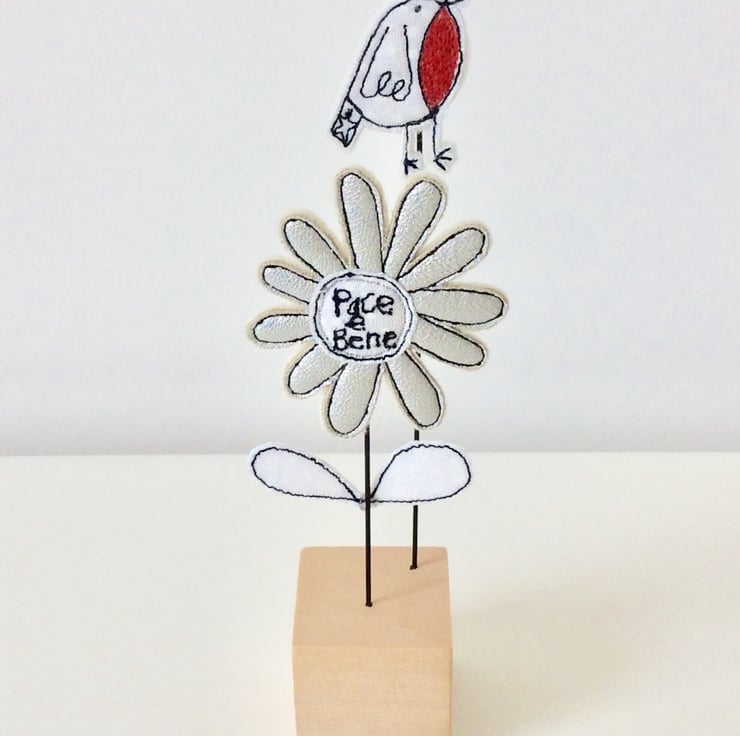 A flower and a Robin (with legs and feet!) with the sewn words ‘Pace e Bene’ on a wooden block.