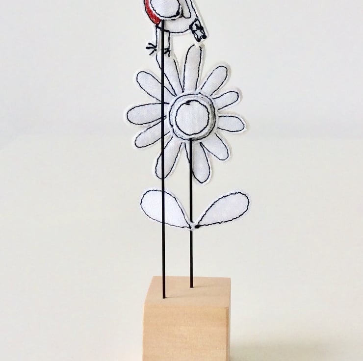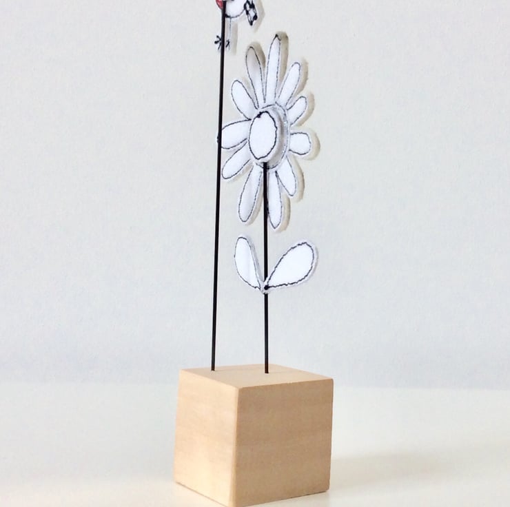 Flower and Robin are created using 100% wool felt, metallic cloth, cotton cloth, free hand machine embroidery and are cut out by hand using very sharp scissors. They are mounted on a 3cm cube wooden block, which can adorn a mantle piece or any flat surface.