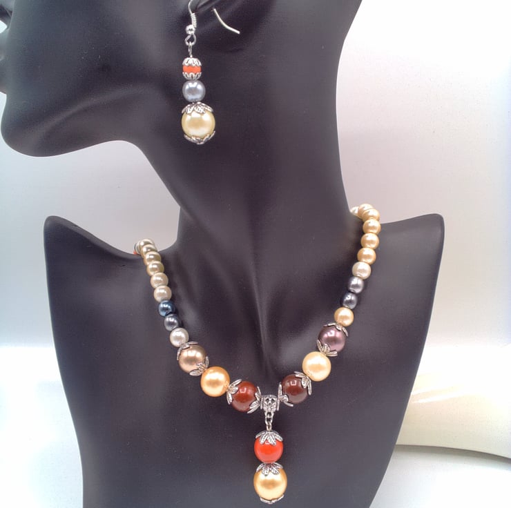 This colourful jewellery set comprises a necklace and a pair of earrings. The necklace is made using graduated chocolate, burgundy, champagne, caramel, grey, cream, orange and gold glass pearls and silver plated bead caps. The pearls range in size from 15 mm down to 6 mm. It has a central pendant made with an orange and a champagne coloured pearls and silver plated bead caps suspended on a silver plated floral barrel shaped bail. The necklace is fastened with a silver plated lobster clasp and the earrings have silver plated ear wires. The necklace is 17.75 inches (44 cm) long with a drop of 1.5 inches (4 cm) for the pendant and the earrings have a 2 inch ( 3.5 cm) drop from the base of the ear hooks. The jewellery set will be dispatched wrapped in tissue paper in an organza bag and delivered to you via Royal Mail first class post. The set would match perfectly with any daytime outfit or an outfit for an evening out. It would make a lovely gift for jewellery loving lady.