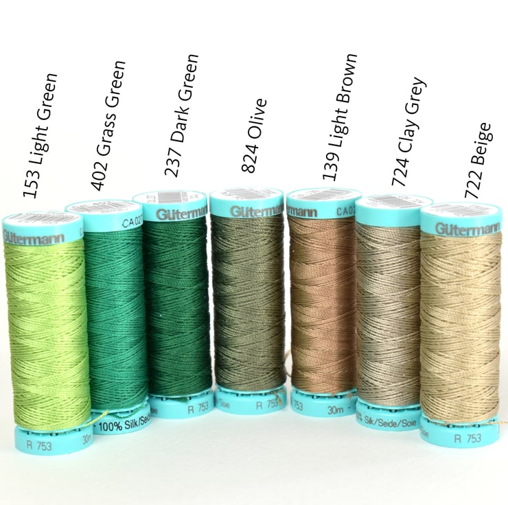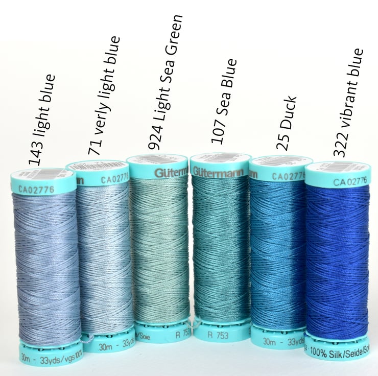 In technical terms, this is Gutermann Silk thread with the denomination R753 which is a dtex 750(3) thread. The spool contains 30m / 33yds.