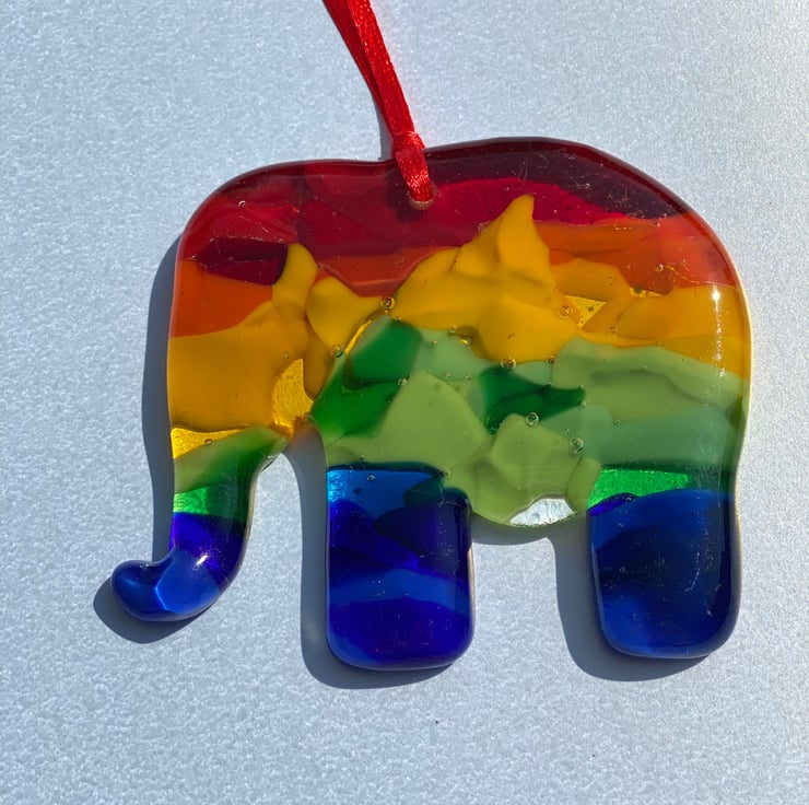 Gorgeous hand crafted fused glass in the colours of the rainbow . Now giving my elephants names and this one is “Hope” . Approx 4 in diameter and 1/4 inch thick , drilled and strung with ribbon. These hanging decorations are unique and great for bouncing light back into the room .