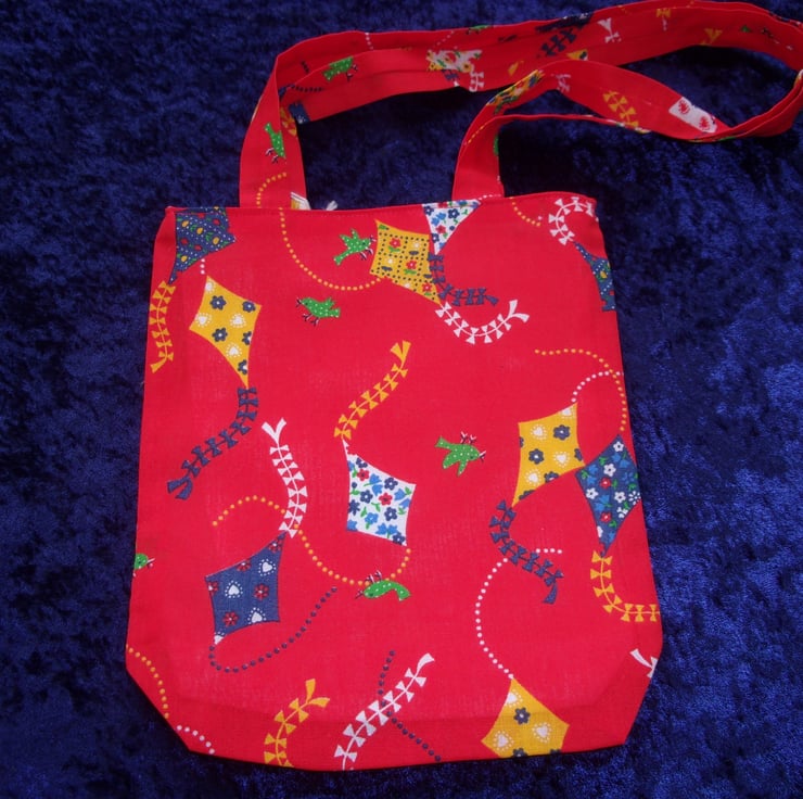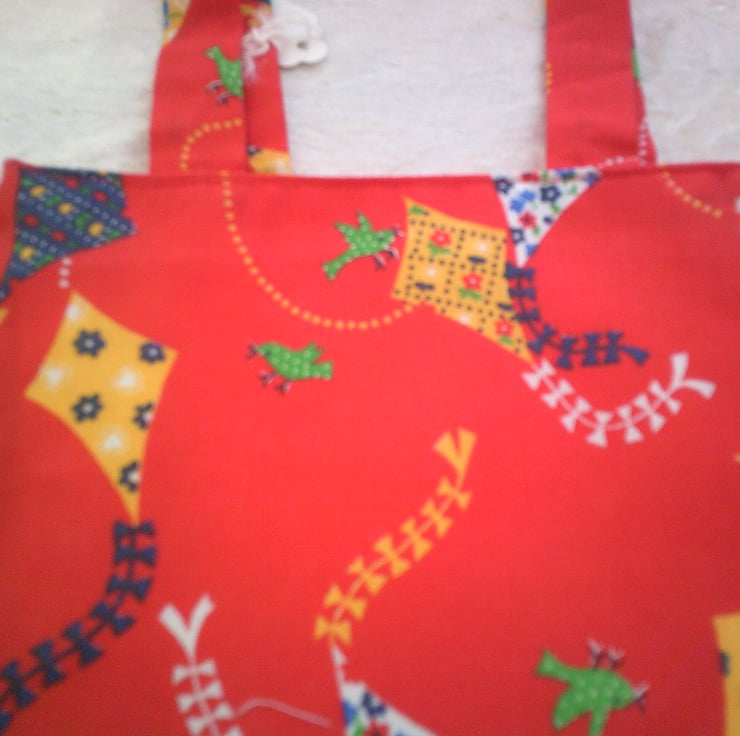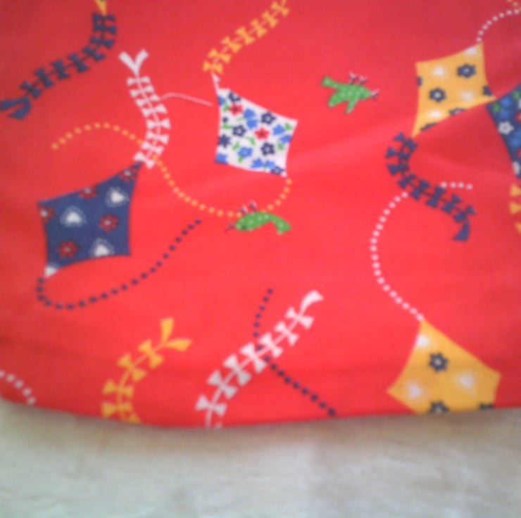 The fabric used has a design of Blue, white and yellow kites on a red background.