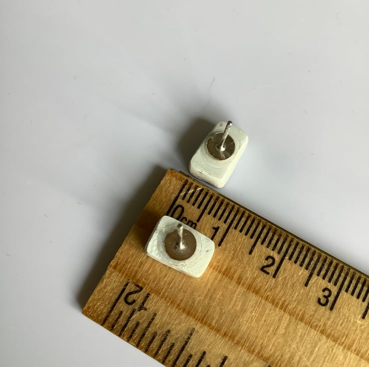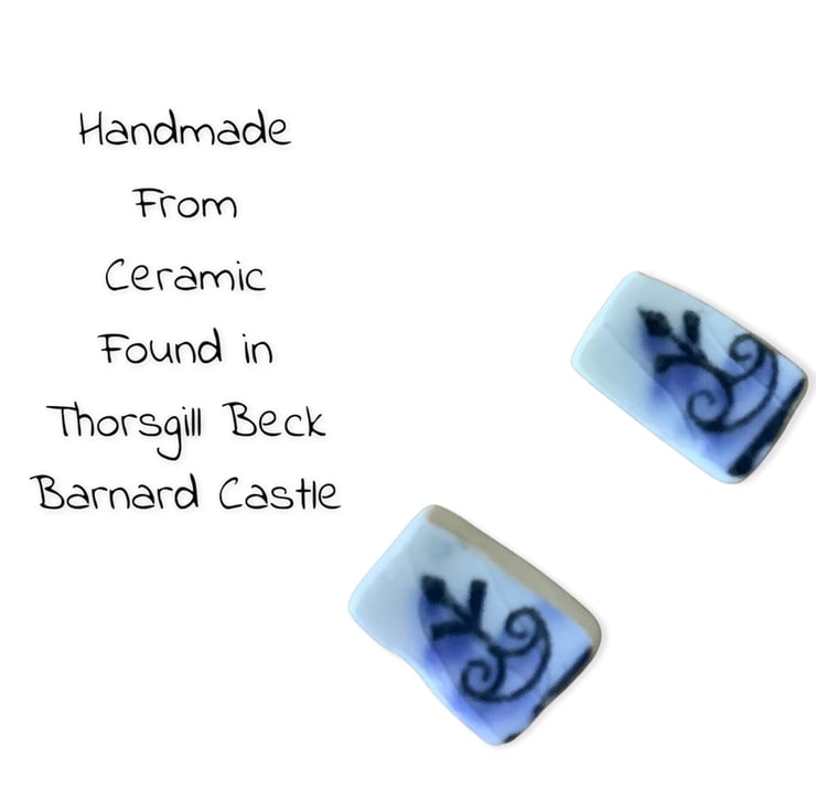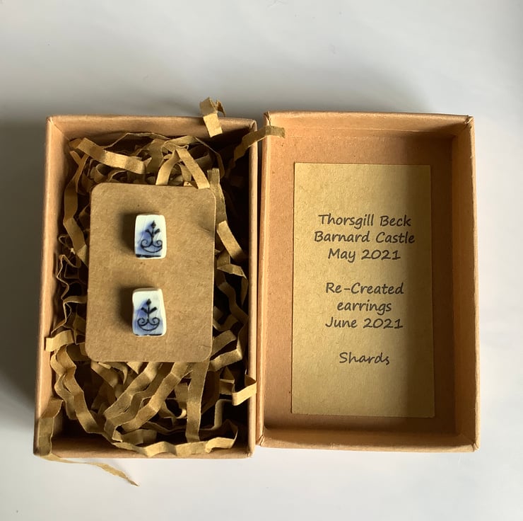 Both earrings show the same pattern but due to the nature of what they are made from and the journey the ceramic has made, each earring is individual. Small, chunky, the idea is to create something new from old, it’s not meant to be perfect.