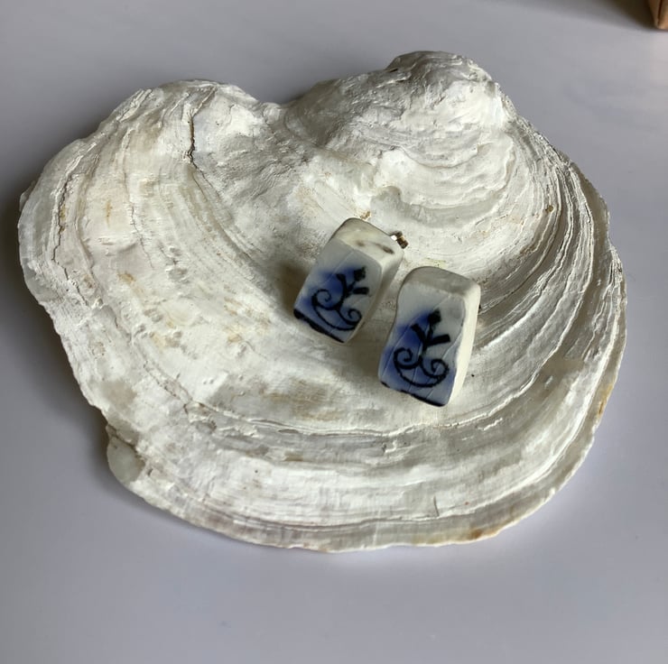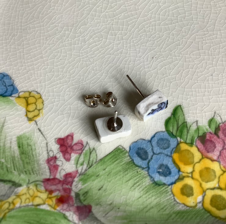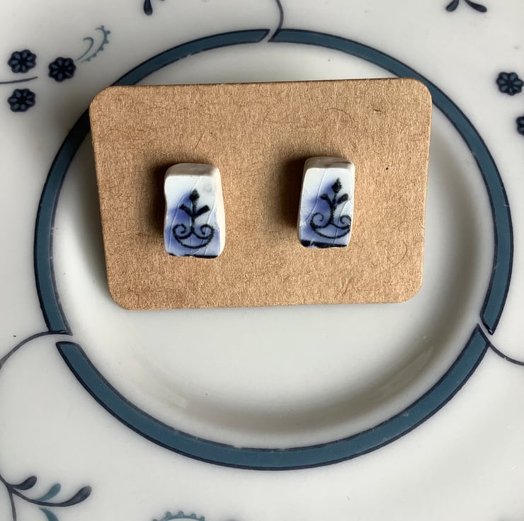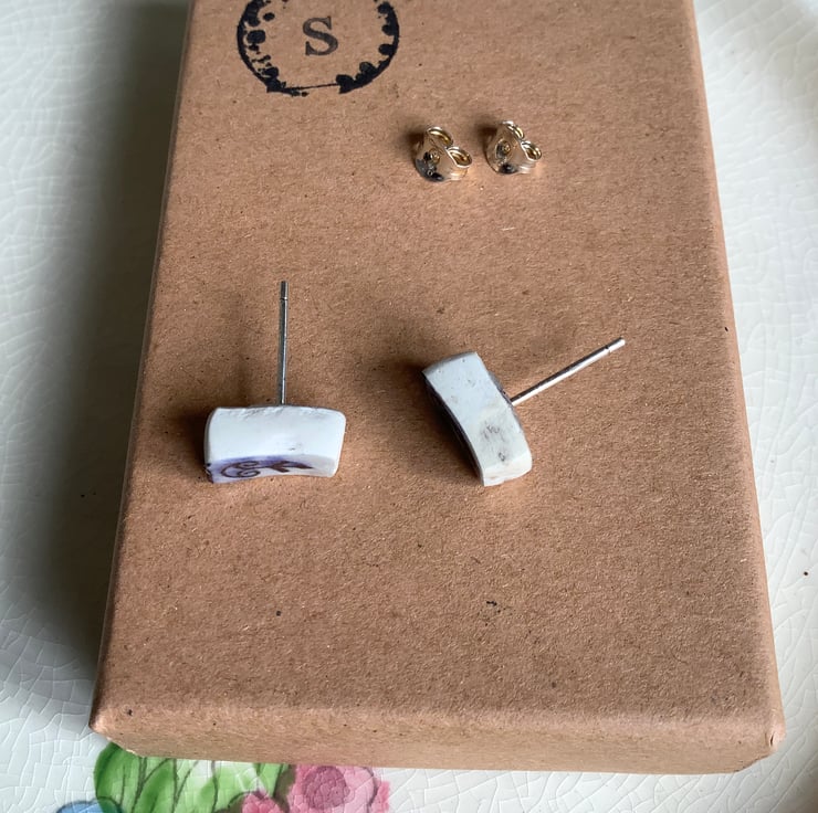 These tiny earrings are made from a small shard that looked like a little plate/saucer, the colour is rich with an unusual intriguing pattern.