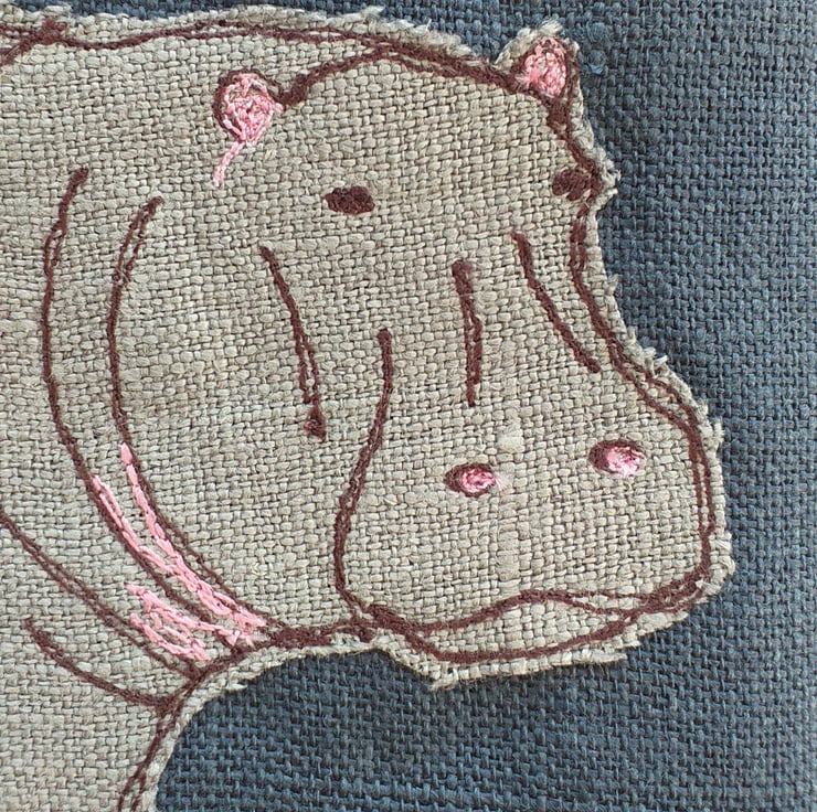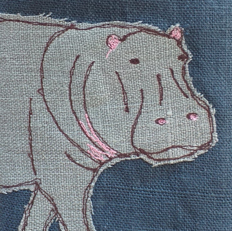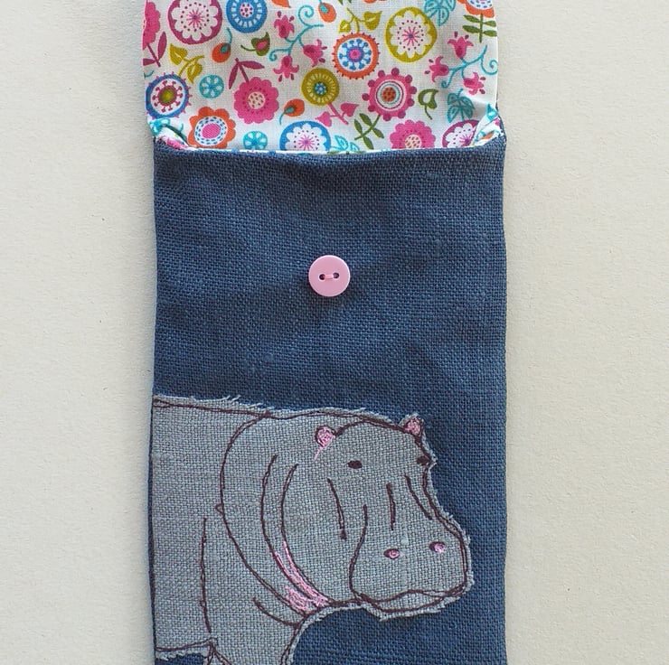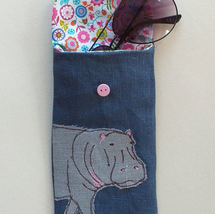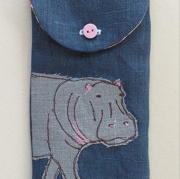 This is a soft but padded specs case, perfect for reading glasses or sunglasses. It has a hippo design made using free motion embroidery over appliqued fabric. The case is made out of a deep blue linen with a bright cotton lining and has a button down flap. The closed case measures approximately 18cm high and 9cm wide.
