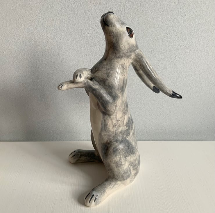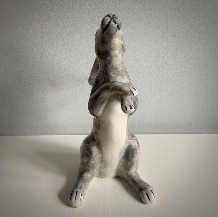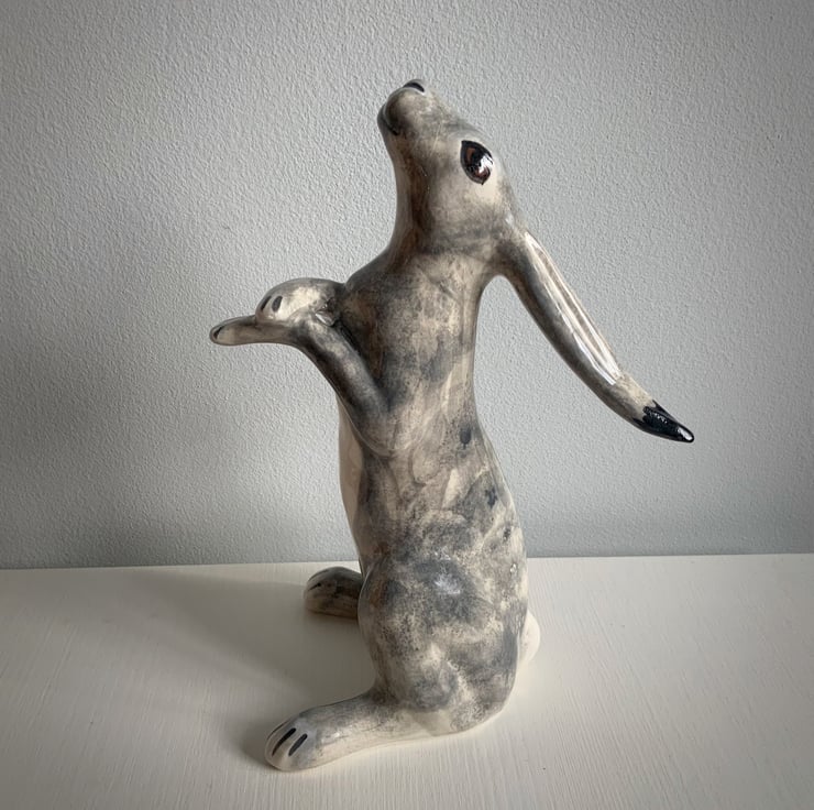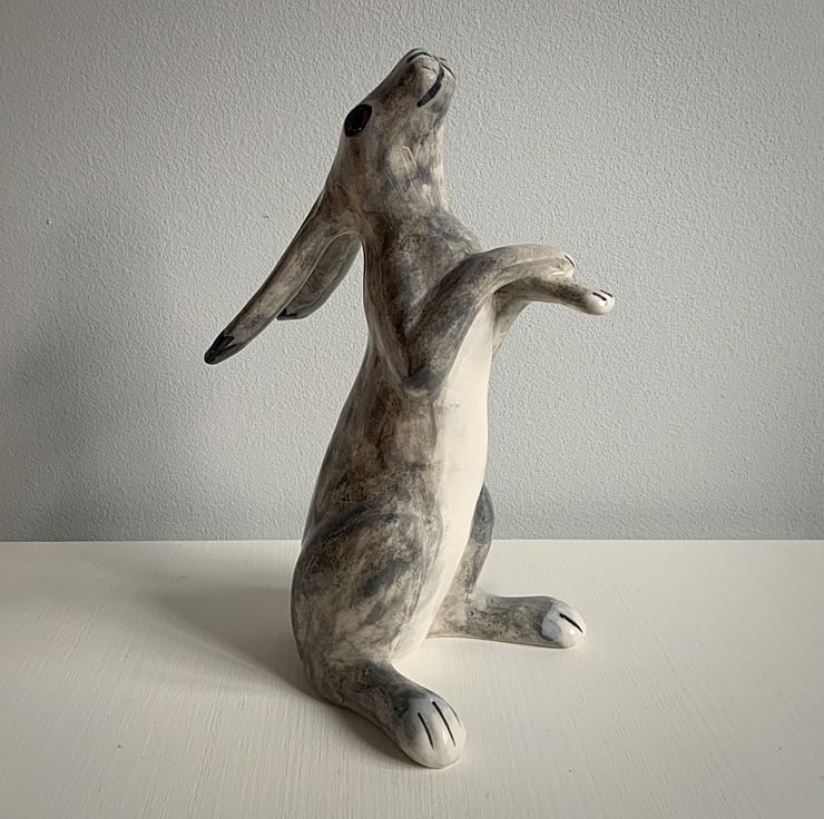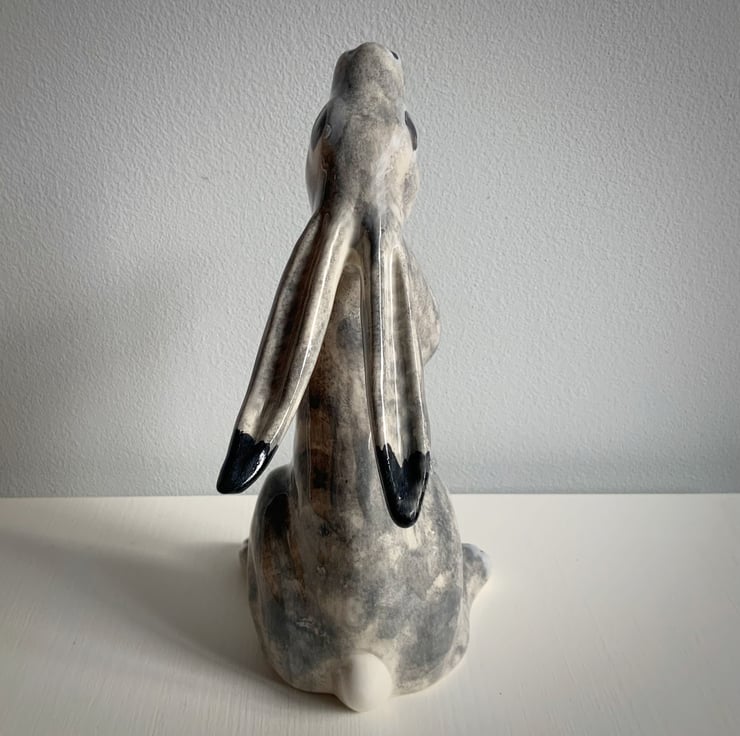 The Grey Moon Gazing hare is finished with a gloss glaze and fired to a temperature just above 1100°c