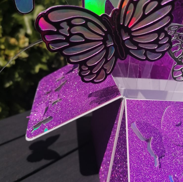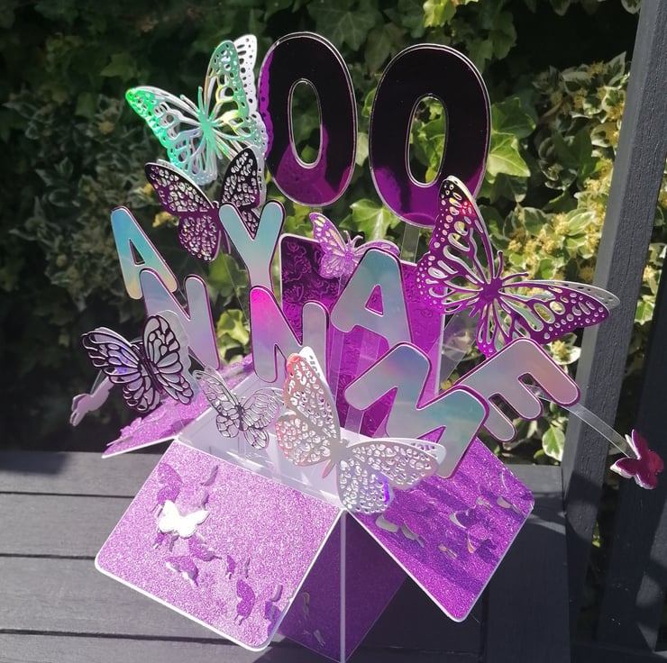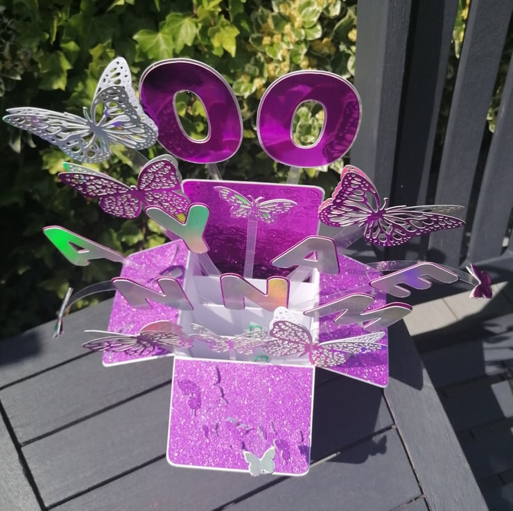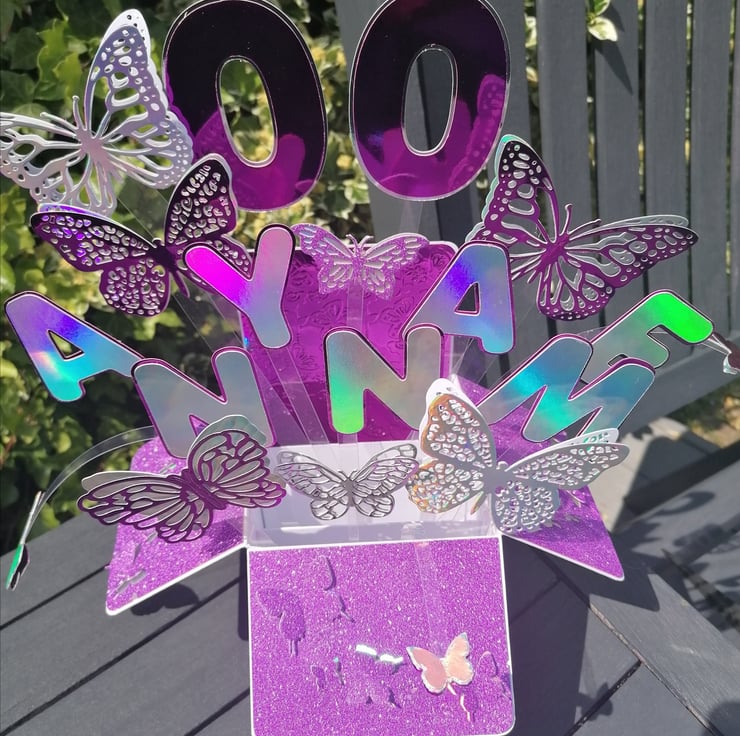 This pop up box card is full of sparkling butterflies and can be personalised with any age plus any name up to 8 letters long.