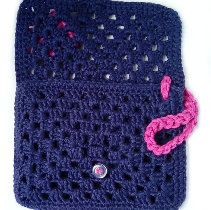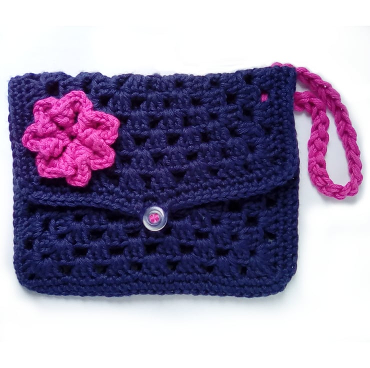 Navy blue bag with a 3D flower in bright pink and matching wrist strap. It fastens with a clear button at the front. It's great for storing pieces of paper or fabric, to keep your project bits and bobs together. It stretches easily and the wrist strap will stretch to any size.