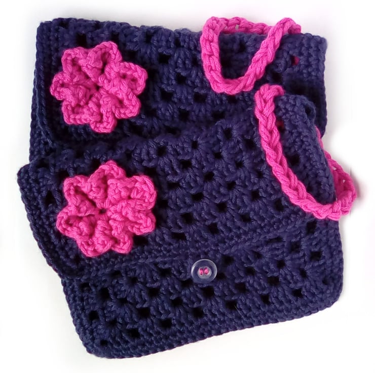 The bag is crocheted in shell stitch and the flower is made in one piece and sewn securely in place.