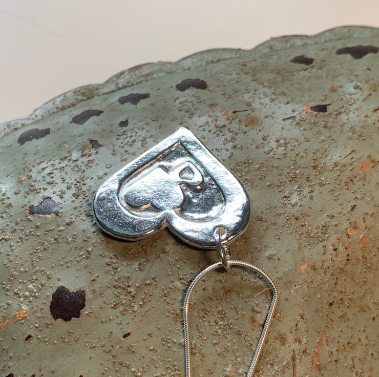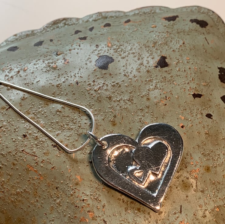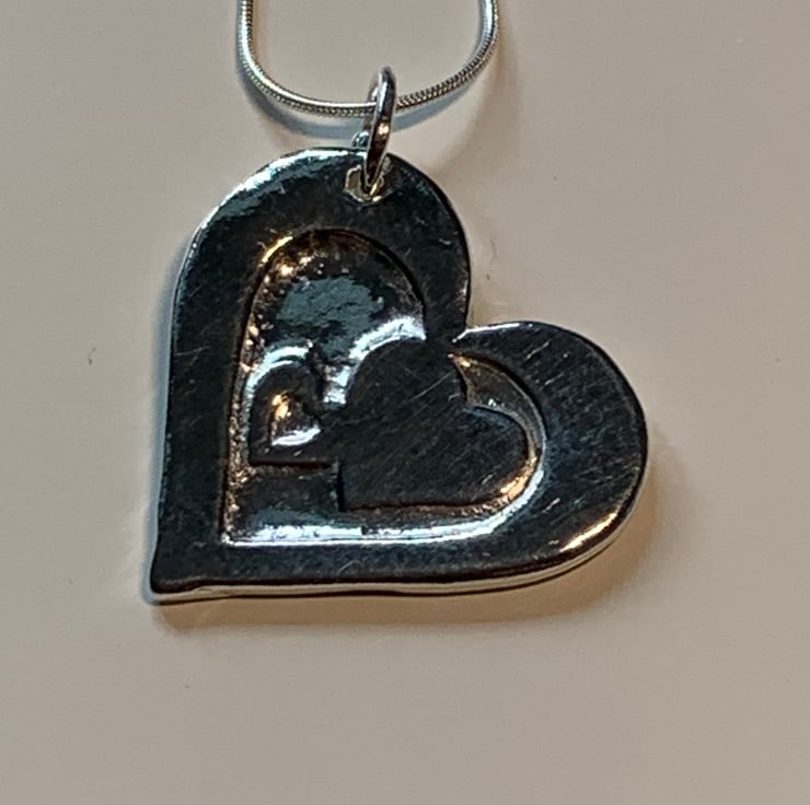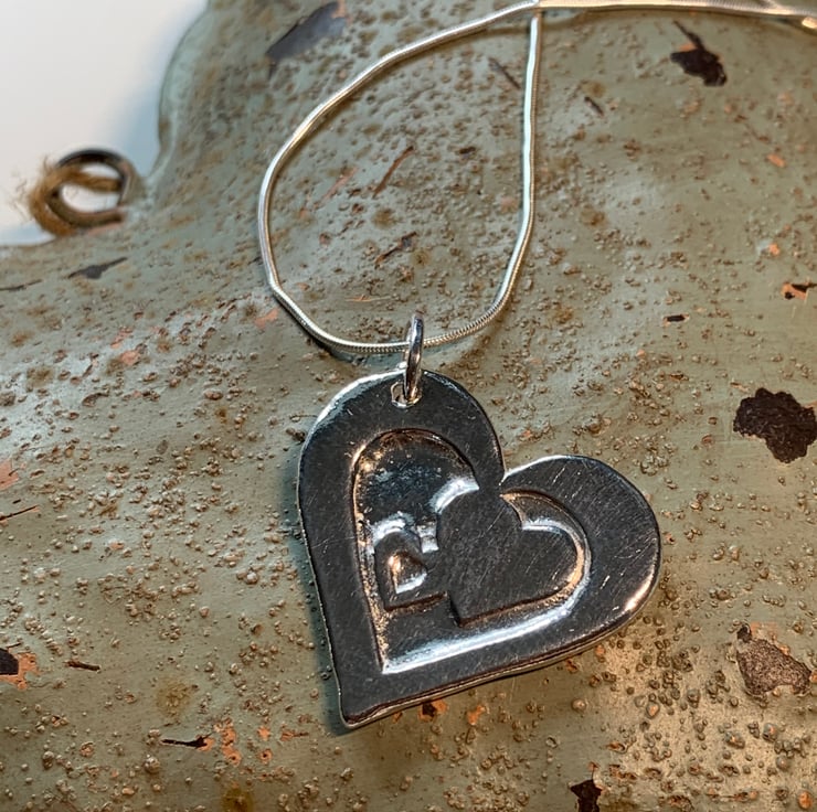 I have made this pendant totally by hand, depicting a heart with smaller hearts in its design, it hangs at a jaunty angle