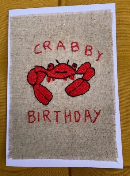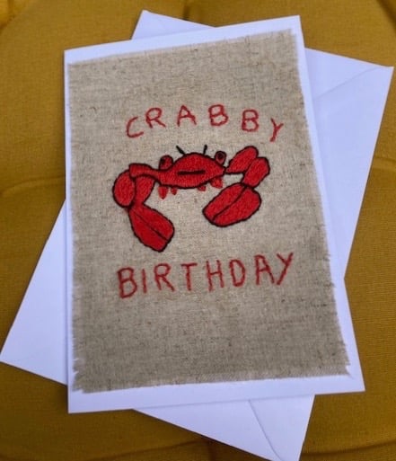 This jolly red crab wishing a happy birthday, has been hand embroidered onto light canvas and mounted on a white greettings card. The card is 4" x 6" & has been left blank inside for your own birthday message. Perfect for the cancerian in your life or just for fun!