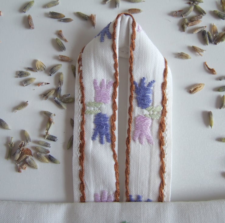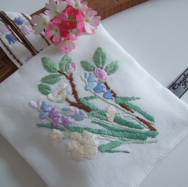 This pretty corner of a vintage tray cloth had seen better days, but its pastel embroidered flowers were all still intact. Just large enough to create a lavender bag with a floral posy on the front, and fill it with dried lavender from North Yorkshire. Pop it over a clothes hanger or in a drawer to keep your clothes smelling sweet and free from moths, or under your pillow for a healthy nights sleep. It would make a nice present for someone learning to embroider, for a bride wanting pretty storage for a wedding dress, or to post to a friend who you havn't seen in ages.