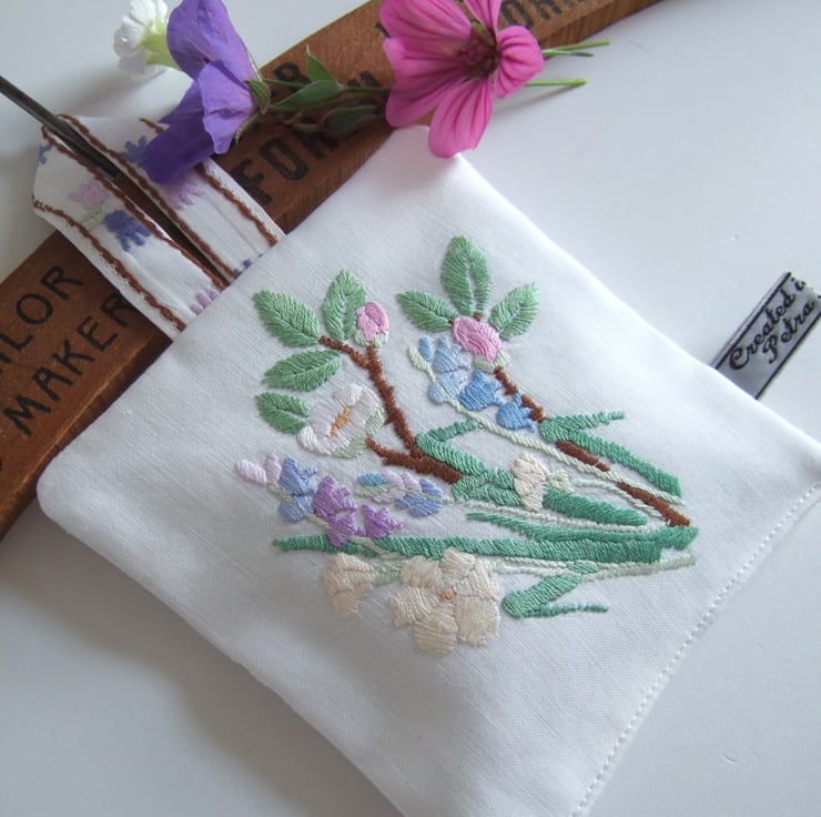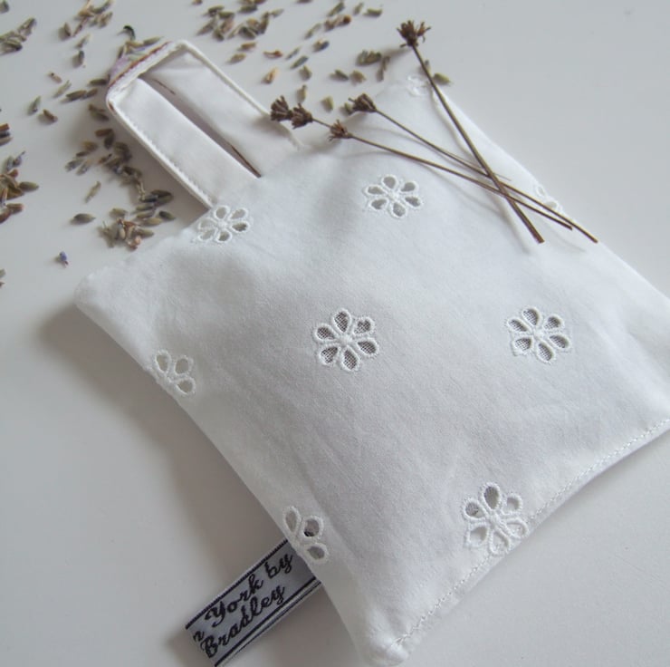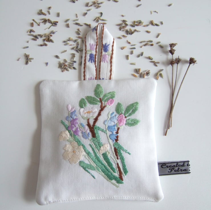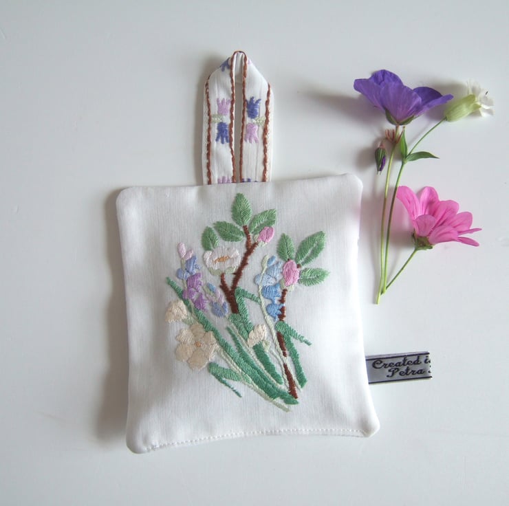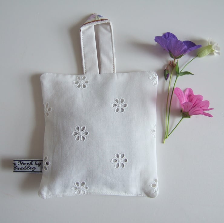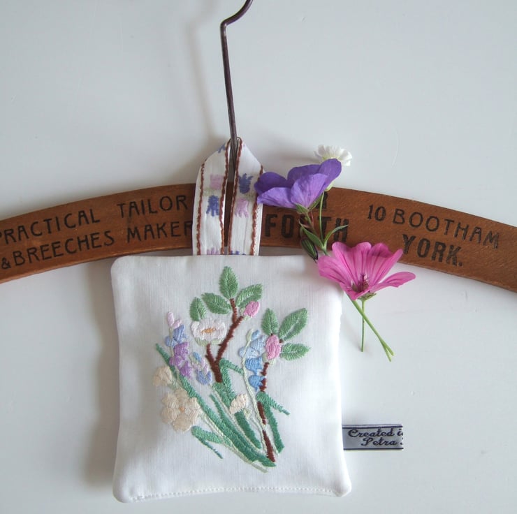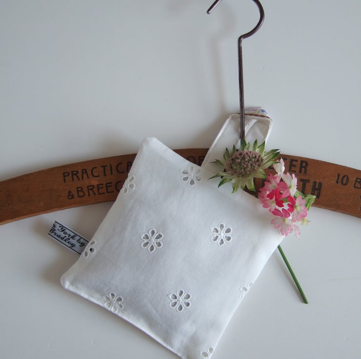 The front is made from softly washed and faded vintage table linen, with the back in broderie anglaise, to let out the scent. It is finished off with my own embroidered name tag.