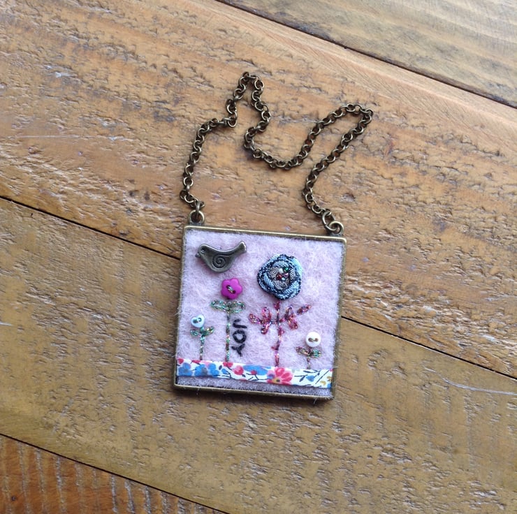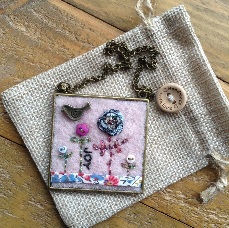 I have embroidered 100%wool felt with a silk ribbon rose and button "flowers". The stems and leaves are sewn with lovely metallic threads. A piece of Liberty fabric chord runs along the bottom and a bronze bird bead sits at the top.