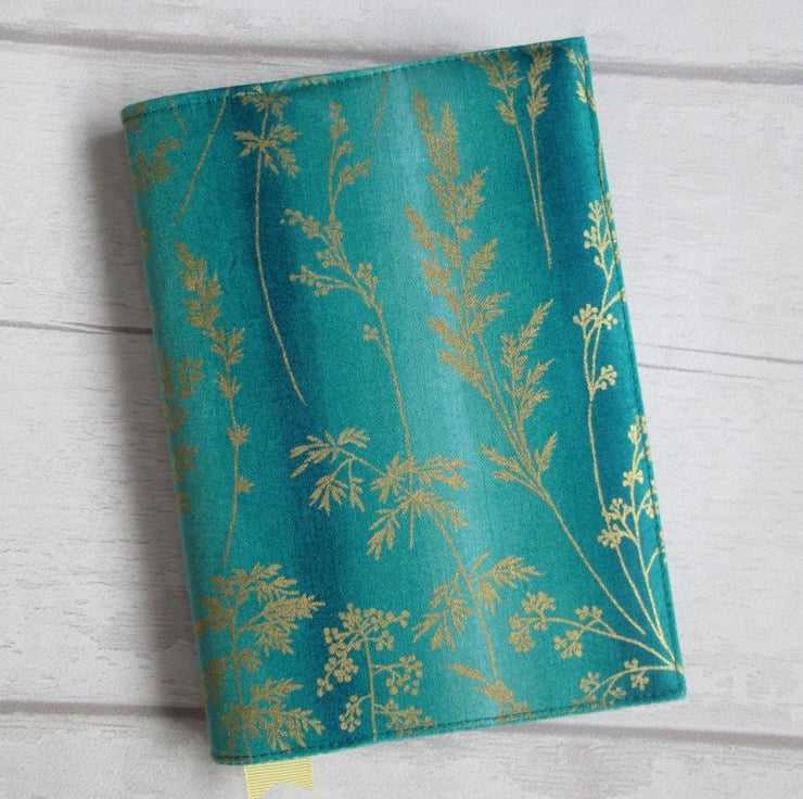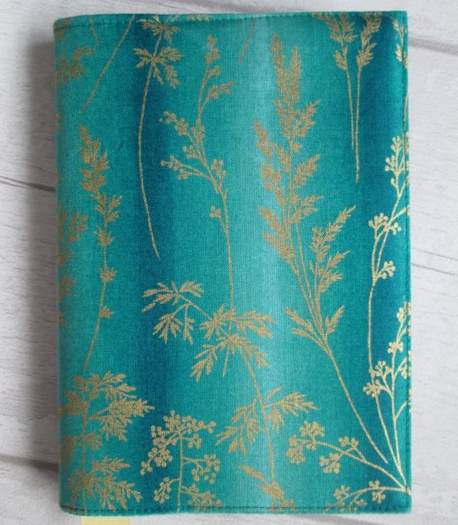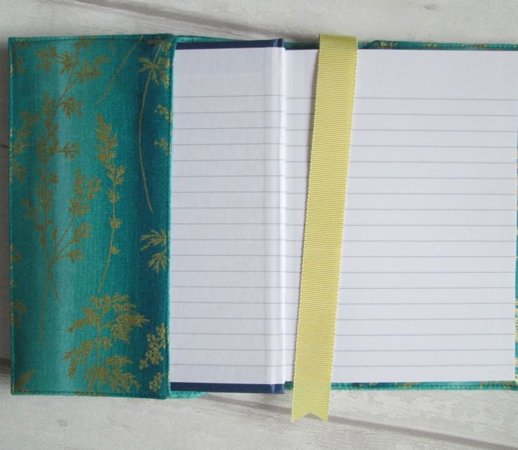 This reusable pocket notebook cover is made from a gorgeous print of metallic gold grasses overlaid on a turquoise ombre background. Teamed with a turquoise lining and finished with a ribbon place marker to comes complete with your choice of either an A6 lined notebook or, for £1.00 extra, a week to view diary.