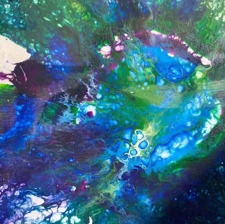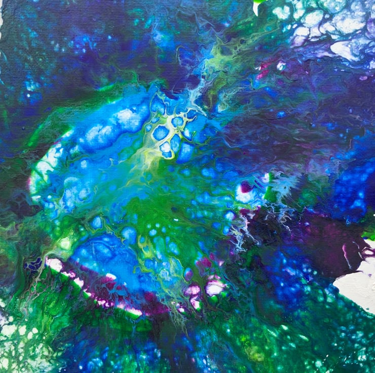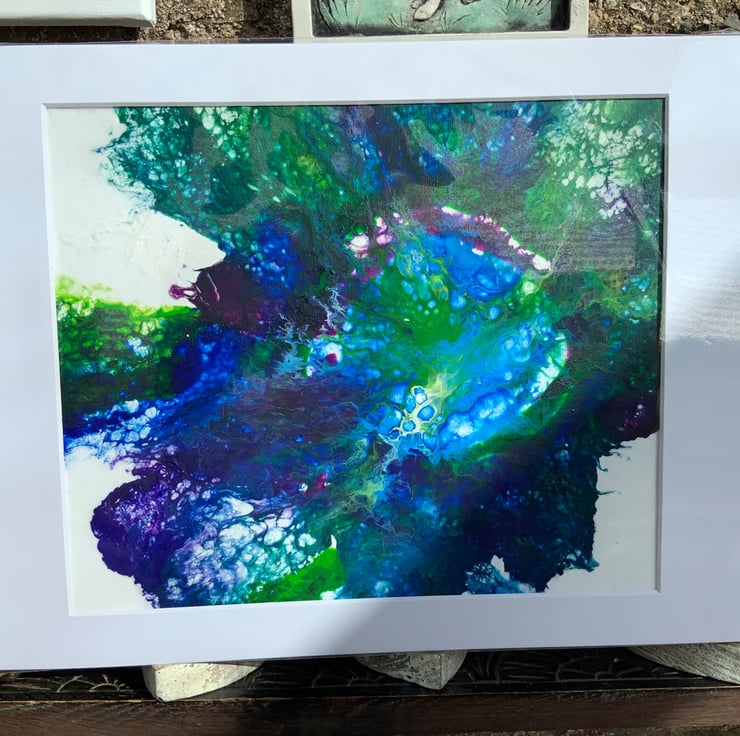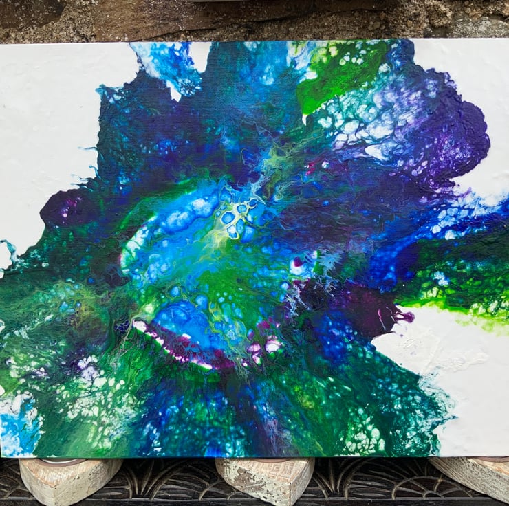 Beautiful Ocean Fluid Art. This painting has stunning Blues, greens, white, all colours that are in the ocean today. This unusual piece measures 12” by 16”. It comes in a protective cellophane sealed bag.