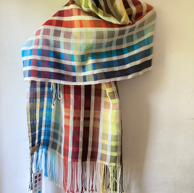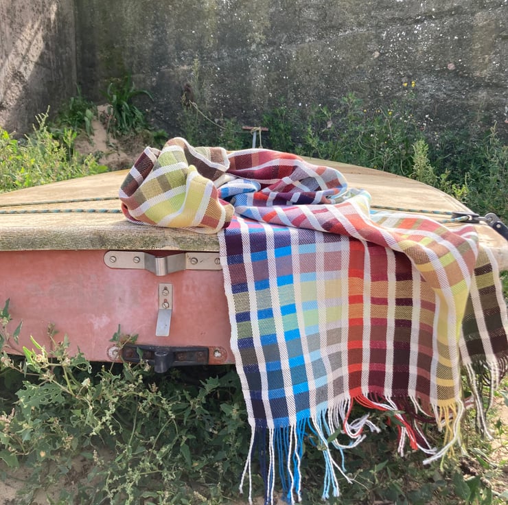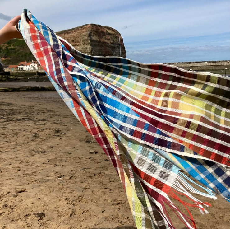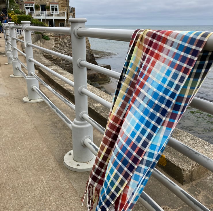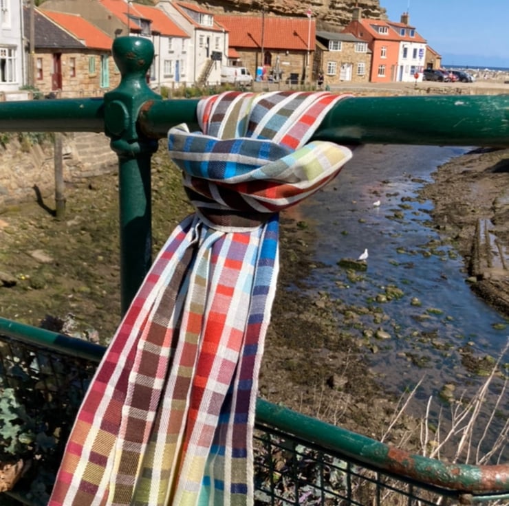 A handwoven wrap scarf in a block twill draft in 15 shades of Staithes on the North Yorkshire coast. The colours are repeated across the weft to produce visual blending- no two blocks are the same across the repeat.Soft and supple, the wrap is light and silky, and large enough to keep the draughts out. The colours are taken from many photographs of this beautiful place to capture the spirit of this gem of a village.